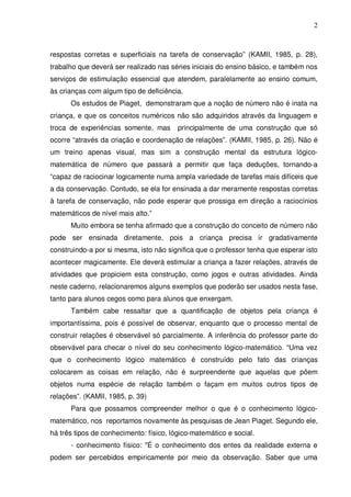 1) O documento discute a importância de se desenvolver o conceito de número em crianças, especialmente crianças cegas, por meio de atividades lúdicas que estimulem o raciocínio ao invés de memorização.