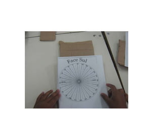 Alunos construíram um relógio de sol no pátio da escola, divididos em grupos mistos de meninas e meninos, e agora estão finalizando o projeto sob a supervisão da professora Valéria e seus assistentes.