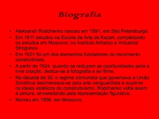 Aleksandr Rodchenko foi um artista russo do século XX. Ele foi um dos fundadores do movimento construtivista na década de 1920 e produziu pinturas abstratas geométricas e fotografias com ângulos incomuns. Sua carreira incluiu períodos dedicados à pintura, fotografia, design gráfico e filme.