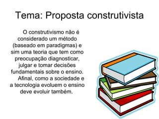 O documento discute a proposta construtivista na educação infantil. Ele explica o que é o construtivismo e como pode ser aplicado nas salas de aula, comparando-o com o método tradicional. Também aborda diferentes métodos de avaliação e como o construtivismo aproxima professor e aluno, utilizando instrumentos do cotidiano para fazer com que os alunos compreendam as situações.