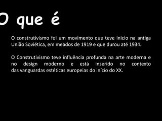 O construtivismo foi um movimento artístico e de design na União Soviética entre 1919-1934 caracterizado pelo uso de elementos geométricos, cores primárias e da bandeira russa. Influenciou a arte moderna, o design e movimentos como a Bauhaus através do trabalho pioneiro do artista russo El Lissitzky, que usou técnicas de produção e esquemas gráficos que dominariam o design no século XX.