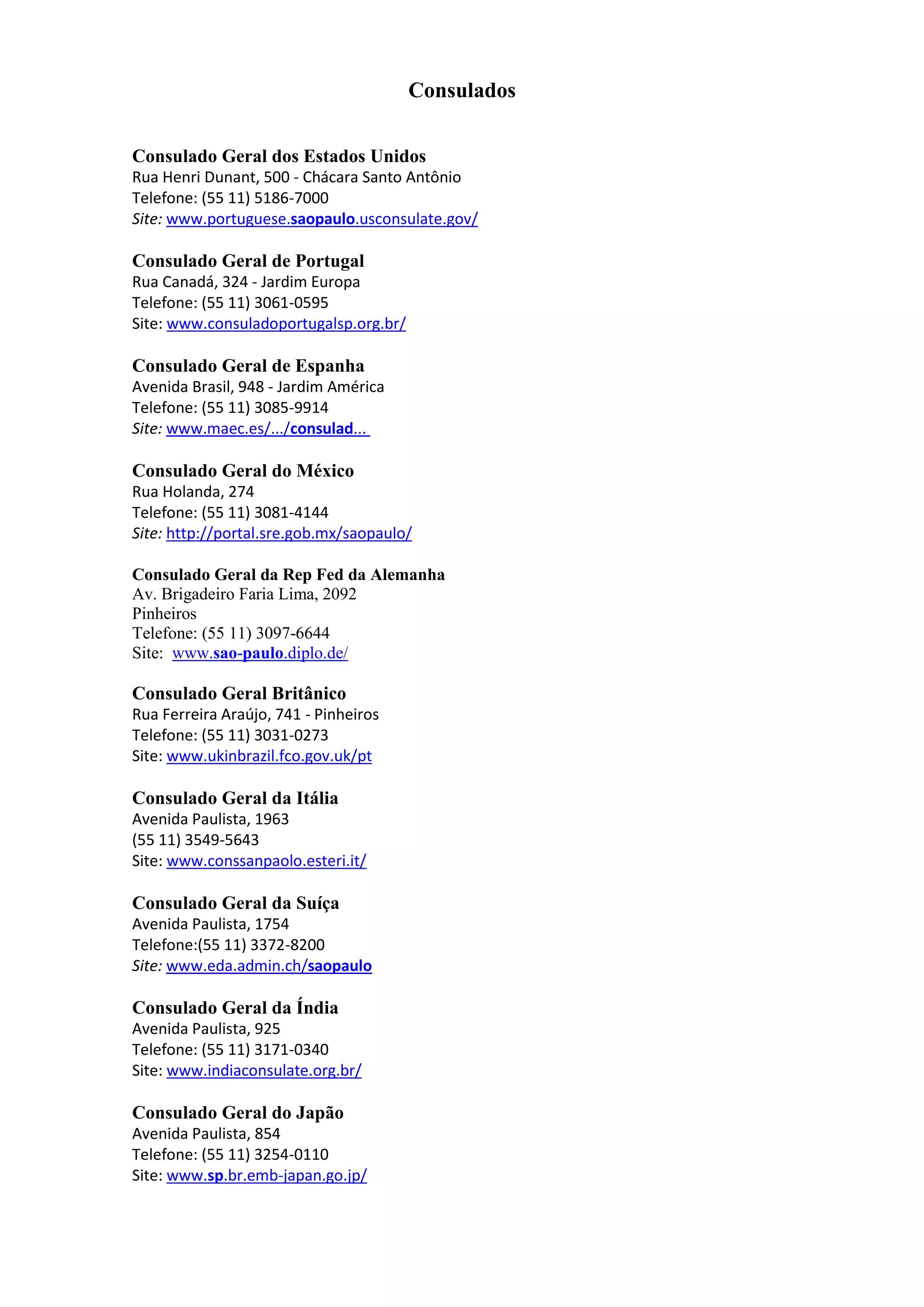O documento lista os principais consulados estrangeiros em São Paulo, fornecendo seus endereços, telefones e sites. São consulados dos Estados Unidos, Portugal, Espanha, México, Alemanha, Reino Unido, Itália, Suíça, Índia e Japão.