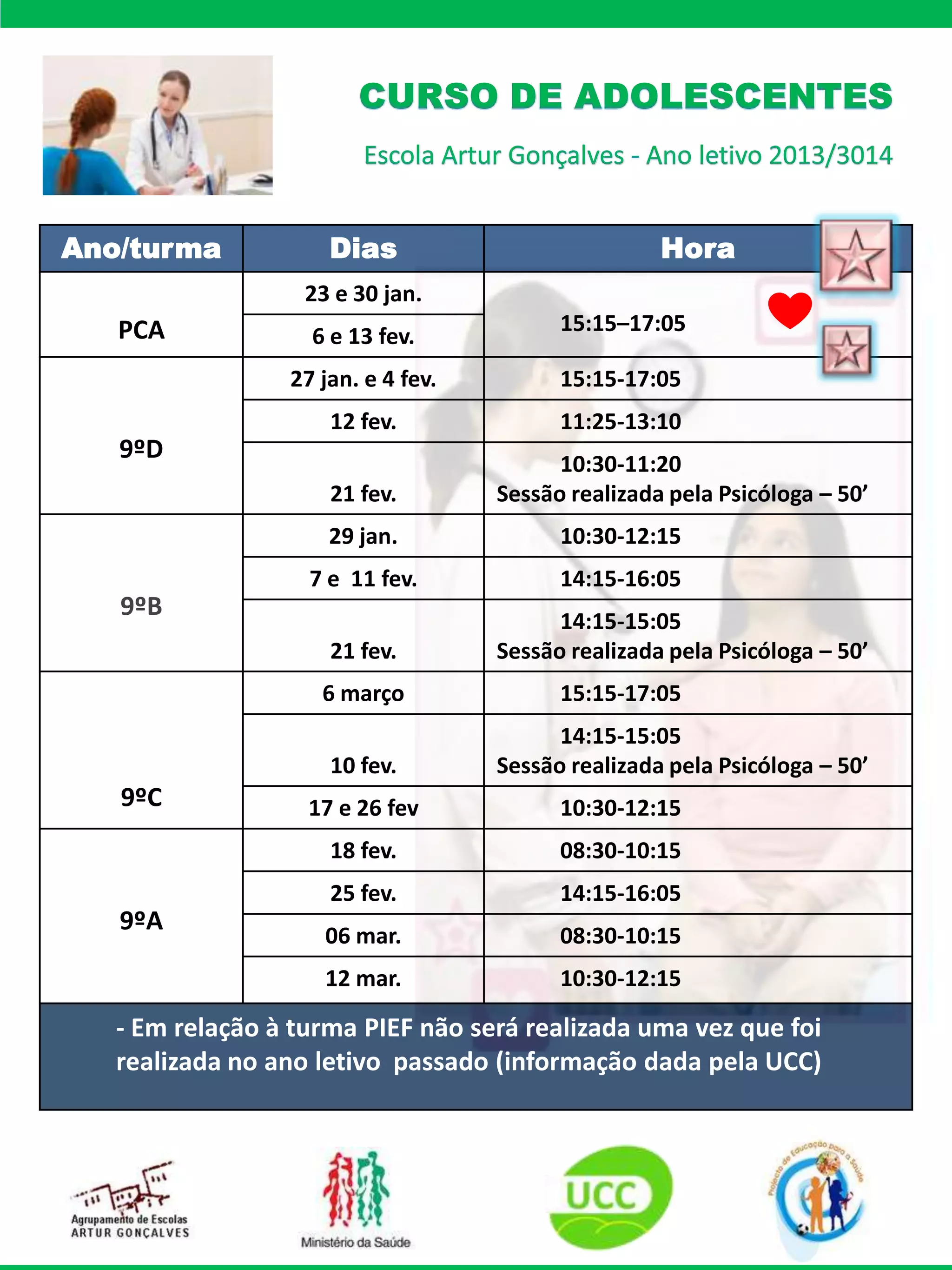 O documento lista os dias e horários de sessões com uma psicóloga para diferentes turmas do 9o ano. As sessões ocorrerão entre janeiro e março com duração entre 50 a 90 minutos. A turma PIEF não terá sessões porque já participou no ano letivo anterior.