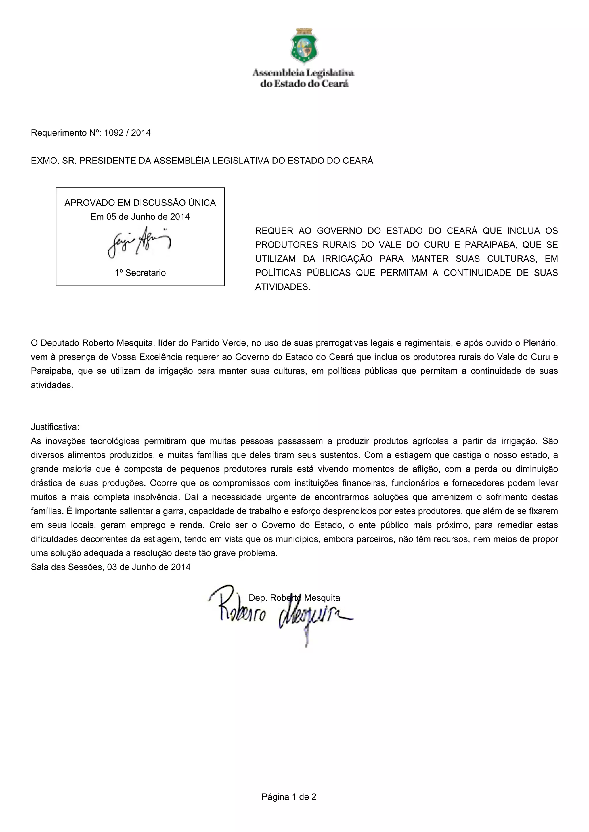 O deputado Roberto Mesquita requer ao governo do estado do Ceará que inclua os produtores rurais do Vale do Curu e Paraipaba, que utilizam irrigação, em políticas públicas que permitam a continuidade de suas atividades agrícolas durante a estiagem, que tem causado perdas e dificuldades financeiras a muitos pequenos produtores. A justificativa é que a irrigação permitiu o cultivo de alimentos que sustentam famílias, mas a estiagem trouxe prejuízos, e o governo estadual pode
