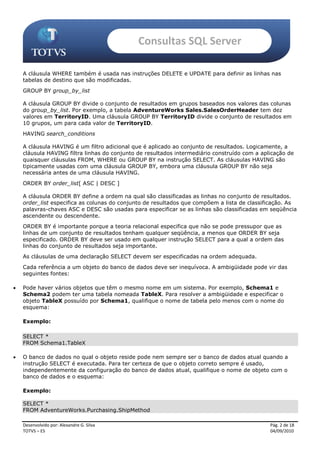 O documento discute a sintaxe e uso de consultas SQL no SQL Server, detalhando cláusulas como SELECT, FROM, WHERE, GROUP BY, HAVING e ORDER BY. Também aborda o uso de funções de agregação, operadores lógicos, e a manipulação de múltiplas tabelas por meio de diferentes tipos de junções. Além disso, fornece exemplos práticos e exercícios para ajudar na compreensão da aplicação das consultas SQL.