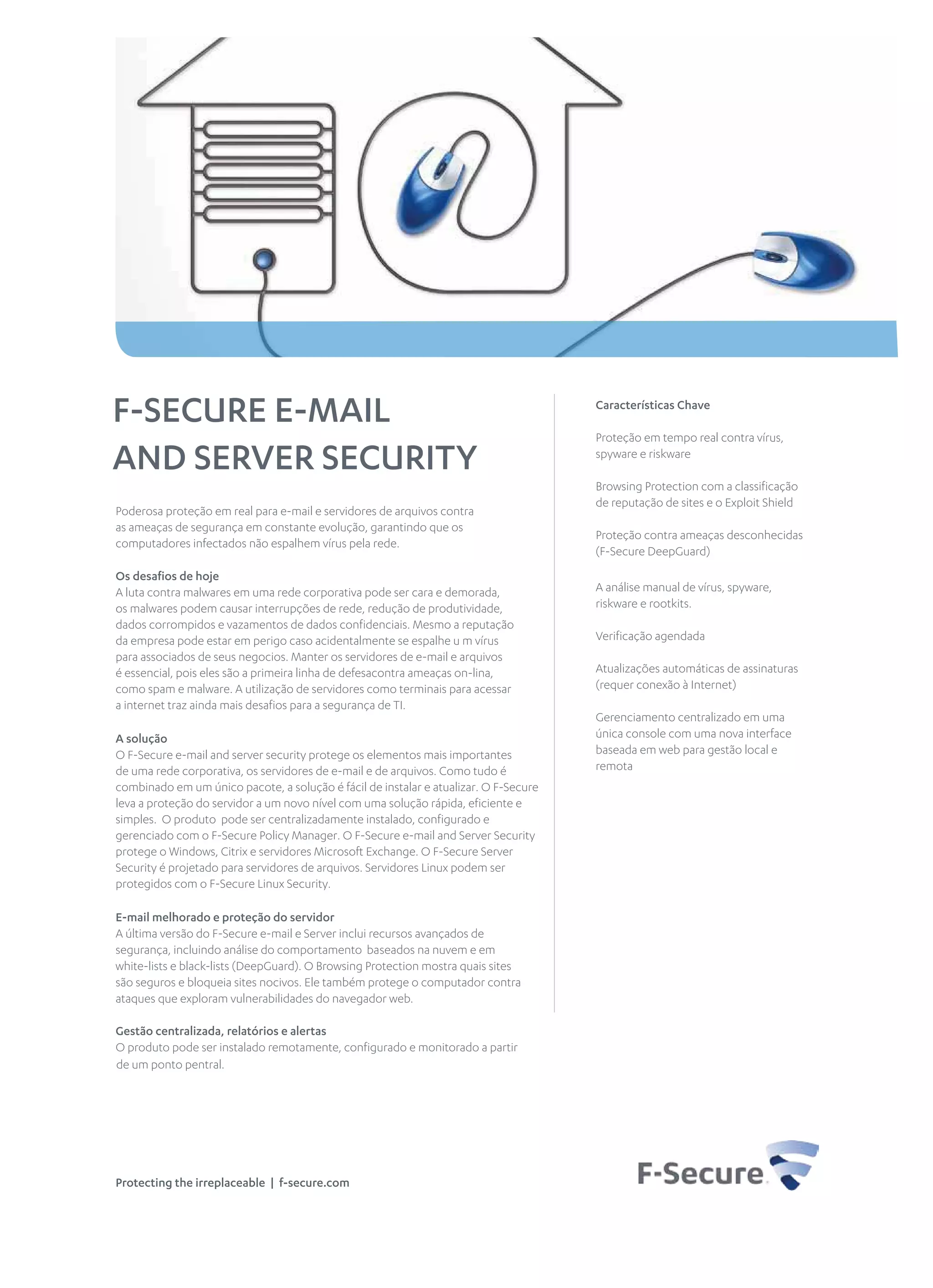O documento descreve a solução F-Secure para proteção de e-mails e servidores de arquivos contra malwares e outras ameaças de segurança. A solução oferece instalação e gerenciamento centralizados, com proteção em tempo real, análise comportamental e bloqueio de sites nocivos. Além disso, é compatível com diversas plataformas, incluindo Windows e Linux, e é altamente premiada por sua eficácia.