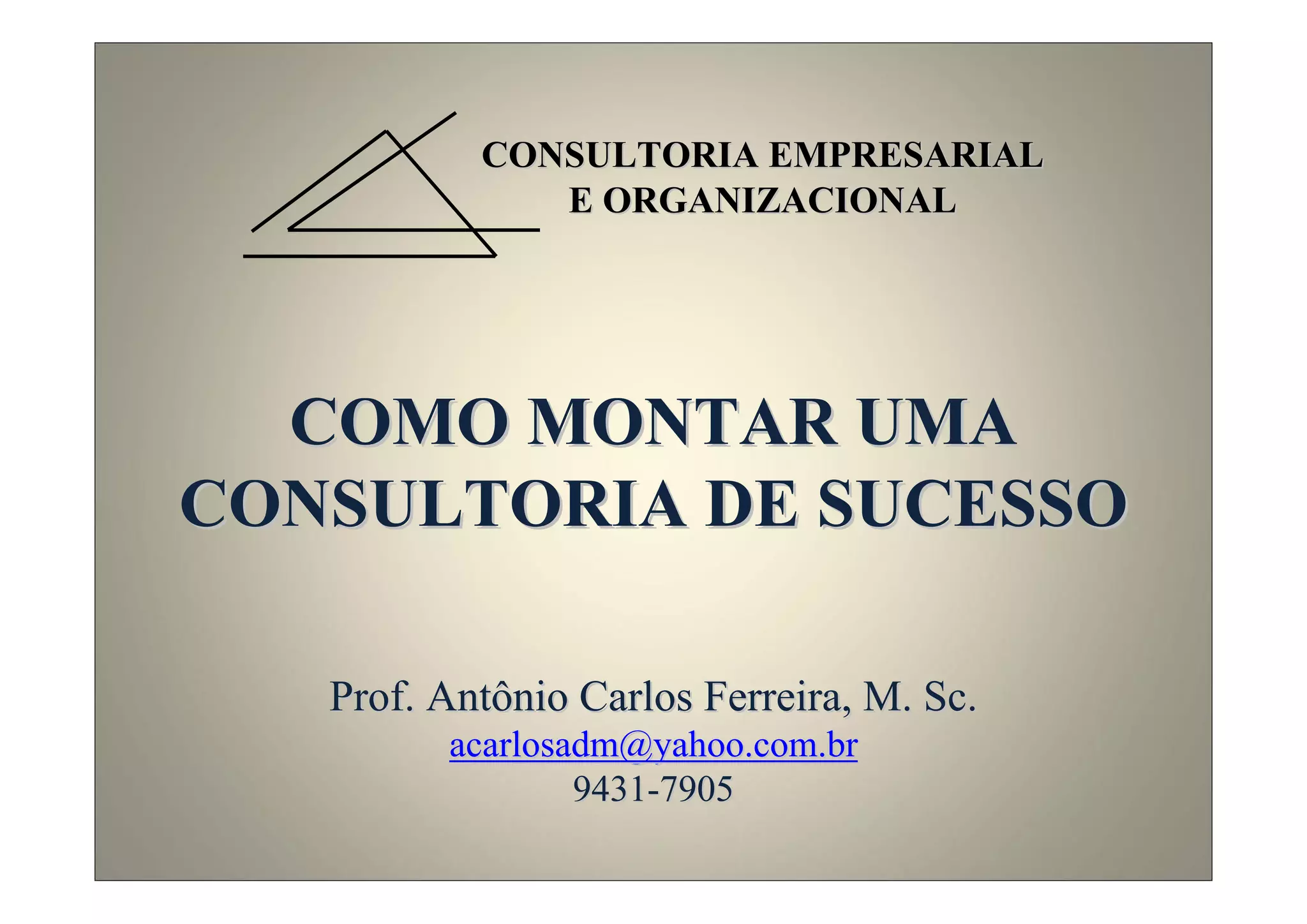 O documento discute como montar uma consultoria de sucesso, fornecendo informações sobre conceitos, características, objetivos e modalidades de consultoria empresarial, além de perfis, competências e recomendações para consultores.