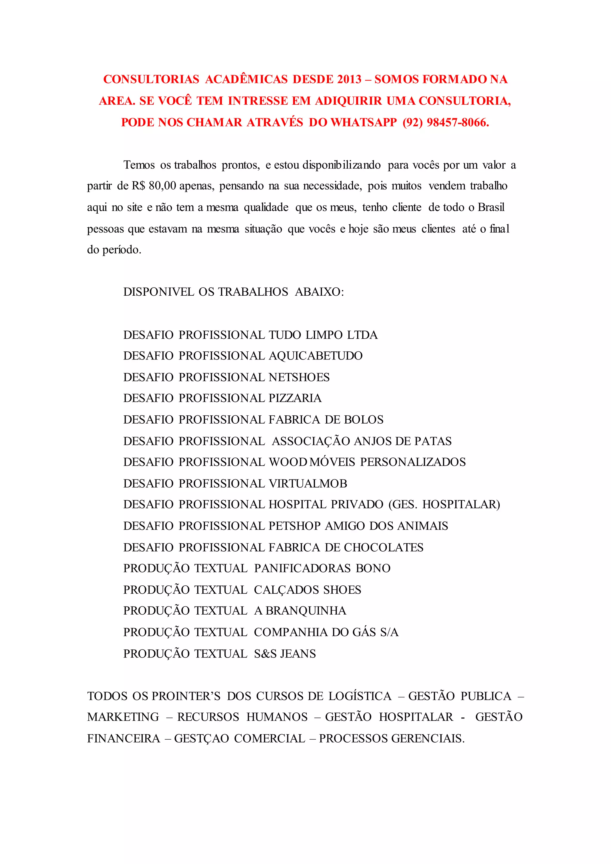 A empresa oferece consultorias acadêmicas desde 2013, com trabalhos prontos disponíveis a partir de R$ 80,00. Os serviços abrangem diversos desafios profissionais e produções textuais em áreas como logística, marketing e gestão pública. O contato pode ser feito pelo WhatsApp para interessados.