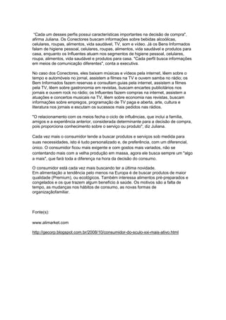 O estudo mostra que o consumidor do século 21 busca mais saúde, realização profissional e dinheiro, além de viver em paz com a família. Ele é mais ativo, procurando informações e experiências, exigindo seus direitos. Busca novidades, diferenciação e produtos personalizados.