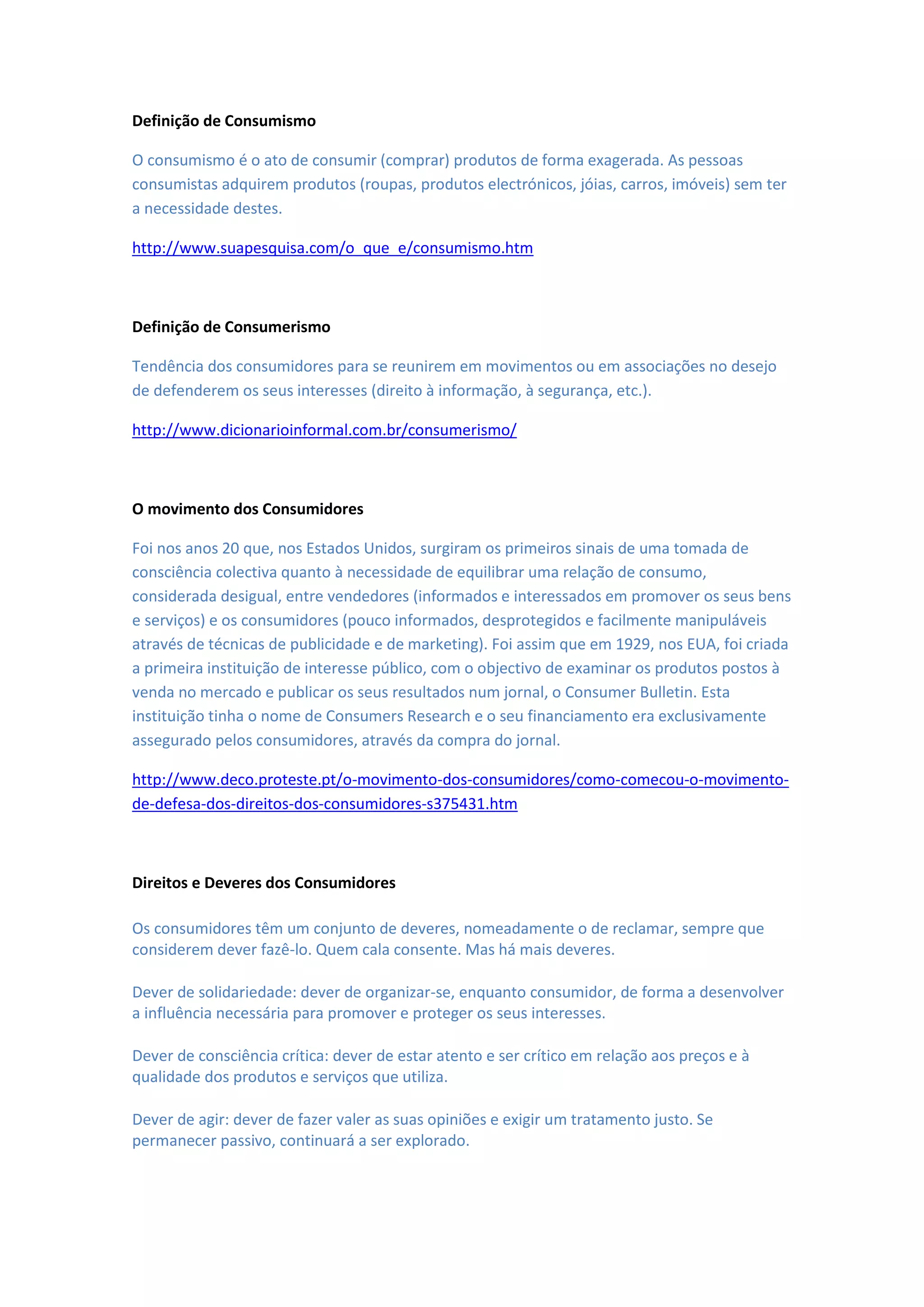 O documento discute o surgimento do movimento de defesa dos consumidores nos Estados Unidos na década de 1920 em resposta à necessidade de equilibrar a relação desigual entre vendedores e consumidores. Também descreve os deveres dos consumidores, incluindo o dever de reclamar, organizar-se e estar atento criticamente aos preços e qualidade dos produtos.
