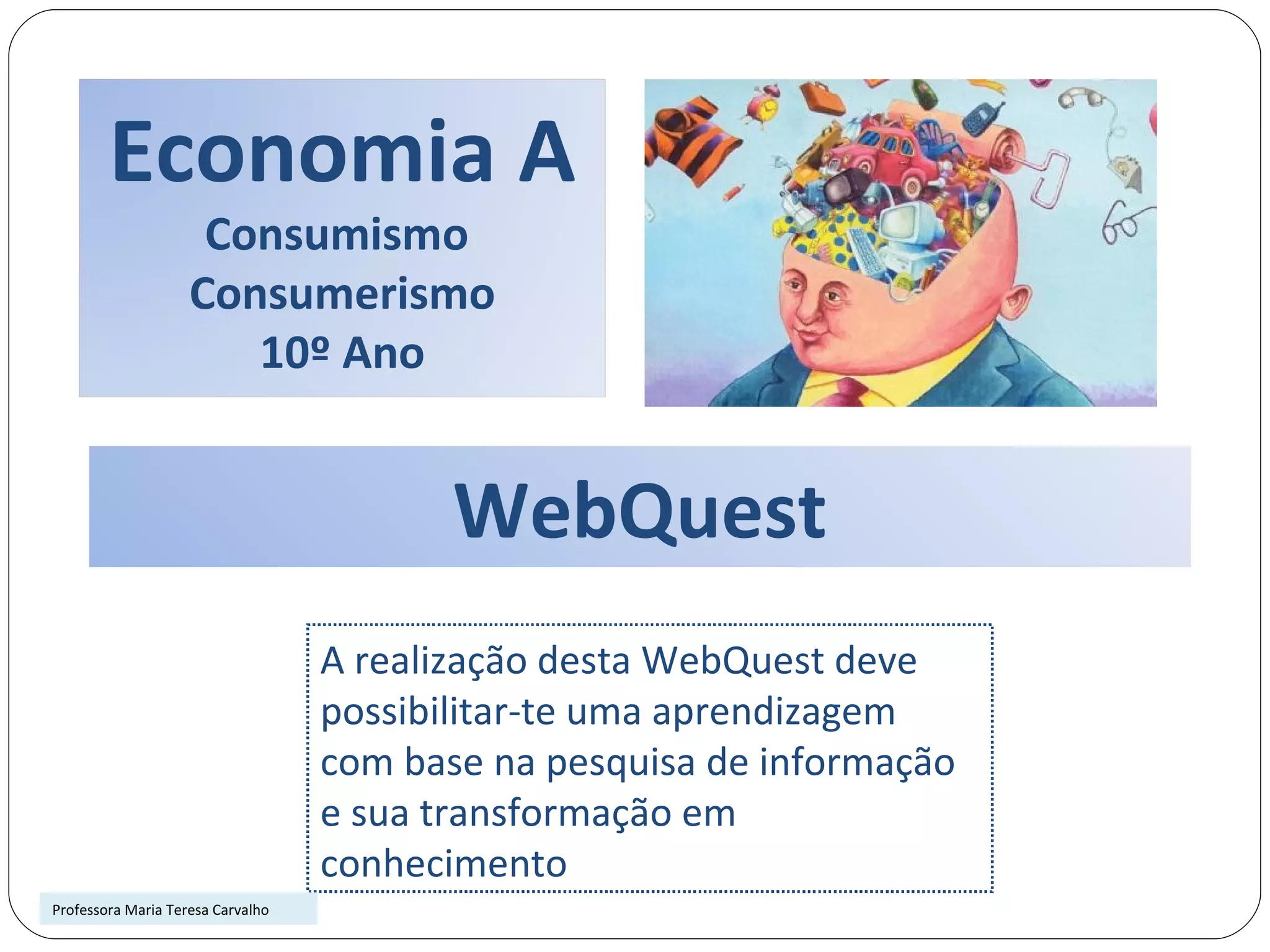 Este documento descreve uma atividade de aprendizagem sobre consumismo e consumerismo para alunos do 10o ano. Os alunos serão divididos em grupos para pesquisar o tema, selecionar informações relevantes e criar um produto como um powerpoint, folheto ou vídeo para educar os colegas sobre os perigos do consumo excessivo e como se proteger como consumidor. A atividade será avaliada com base no desempenho do grupo, qualidade das informações coletadas e do produto final.