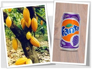 O documento descreve os processos de produção do chocolate Todd e da bebida Fanta Uva, incluindo suas principais matérias-primas e etapas de fabricação. Também fornece detalhes sobre os fornecedores e preços de venda desses itens.