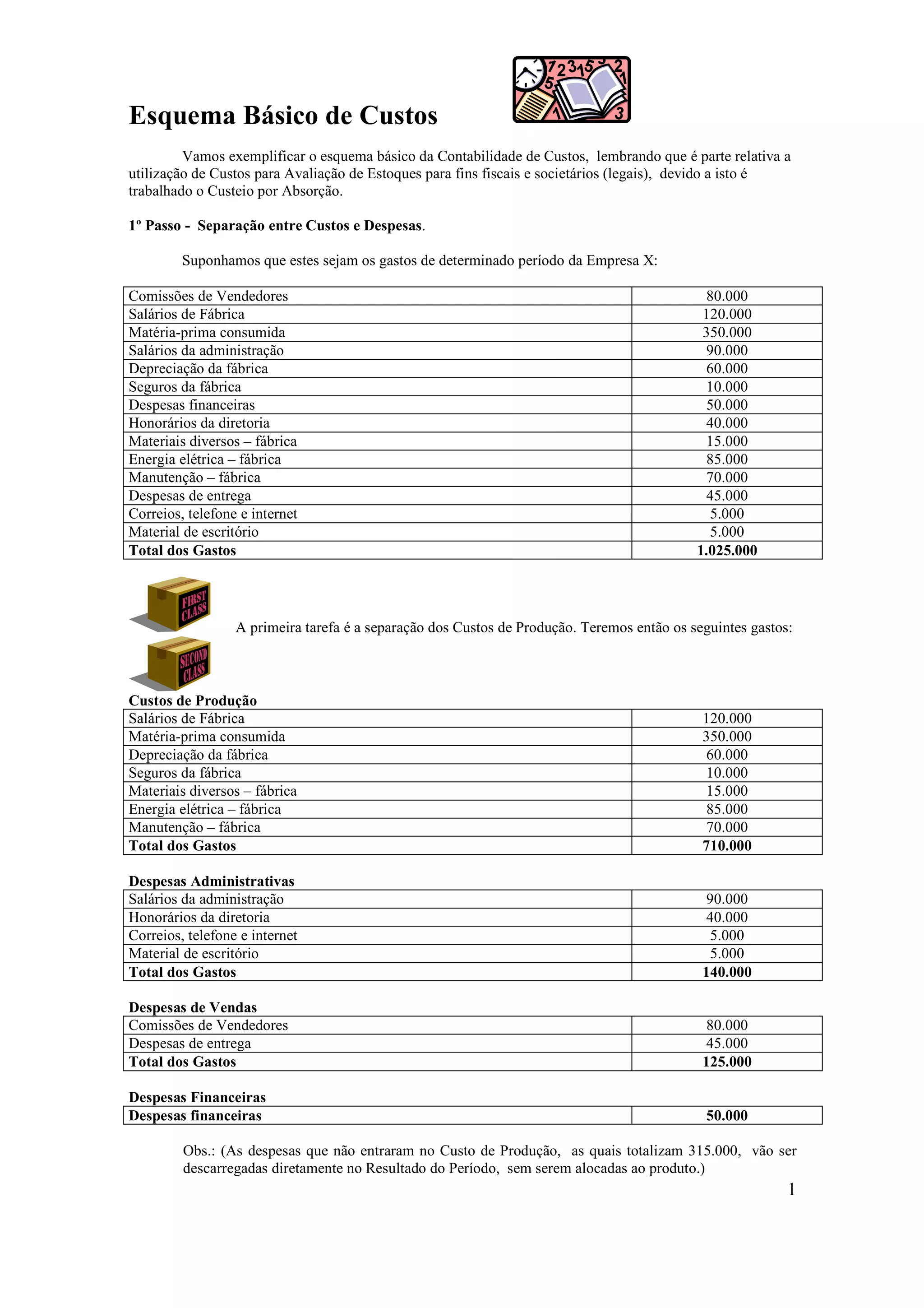 1) O documento explica o esquema básico de custos de produção, separando custos de produção, administrativos, de vendas e financeiros.
