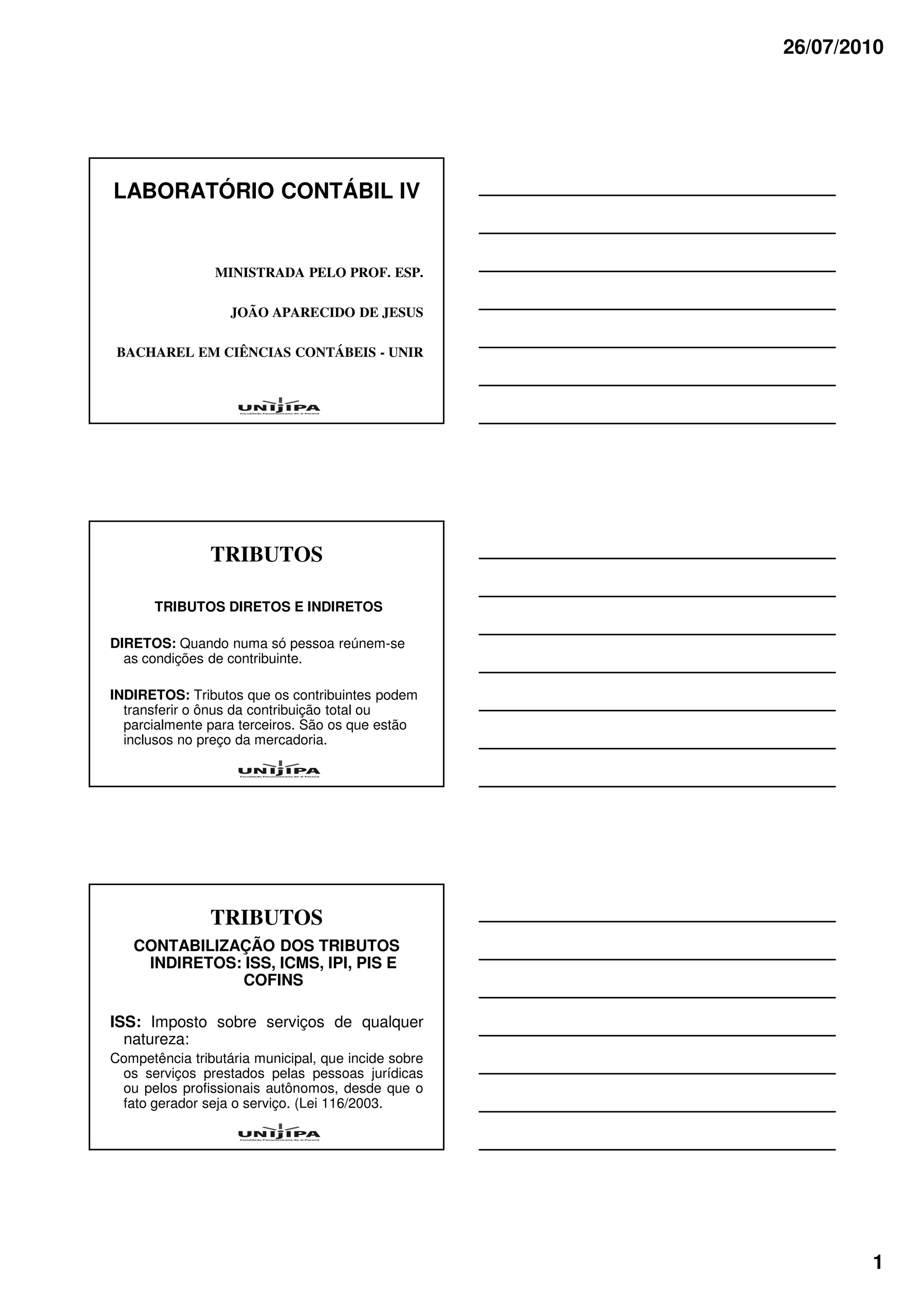 O documento discute os principais tributos no Brasil, como ISS, ICMS, PIS e COFINS. Explica como esses tributos são contabilizados, incluindo a classificação como diretos ou indiretos, a base de cálculo, alíquotas e registros contábeis para pagamentos e créditos tributários.