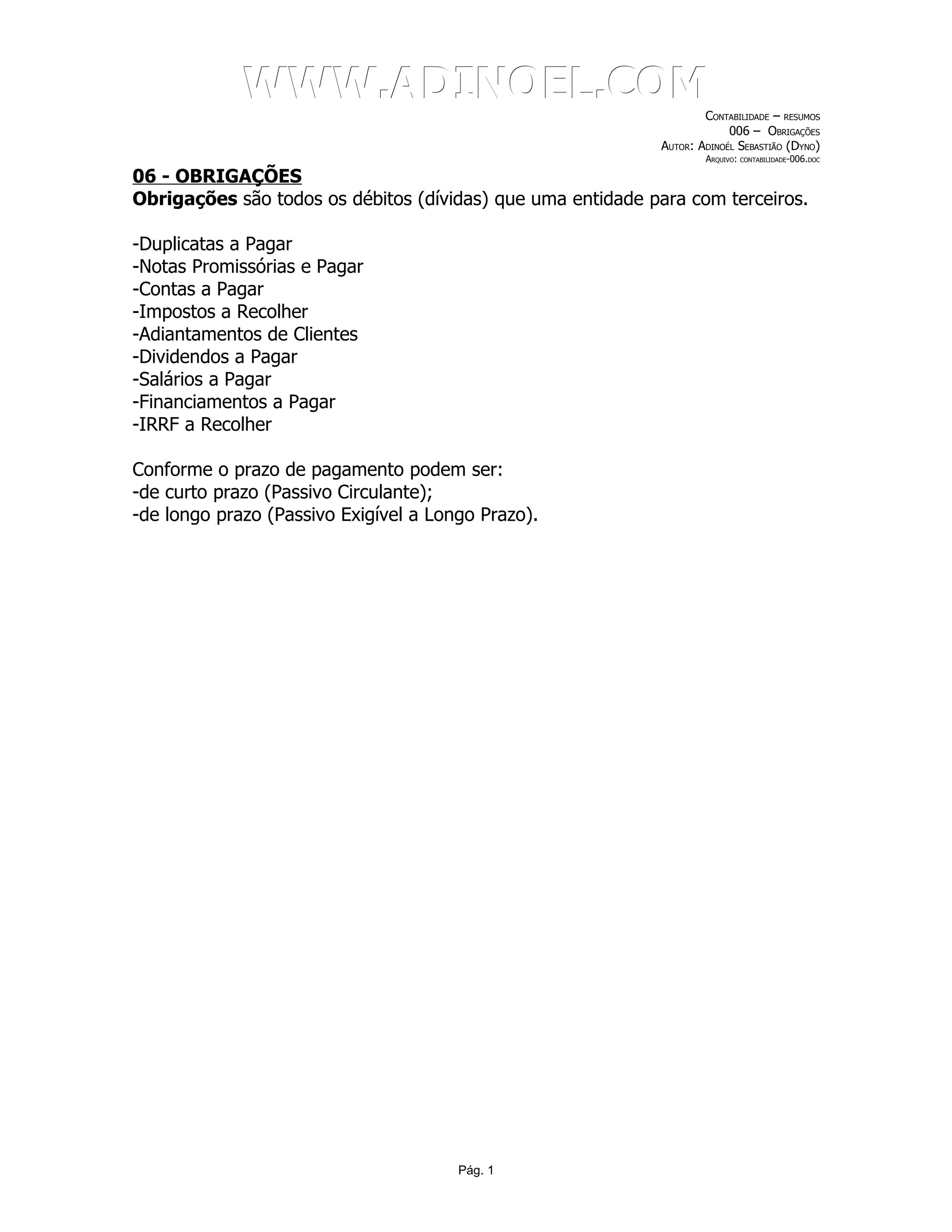 O documento descreve as obrigações de uma entidade, que são todos os débitos ou dívidas para com terceiros. Ele lista os tipos de obrigações como duplicatas a pagar, notas promissórias a pagar, contas a pagar, impostos a recolher, entre outros. Também diferencia obrigações de curto prazo no passivo circulante e de longo prazo no passivo exigível a longo prazo.