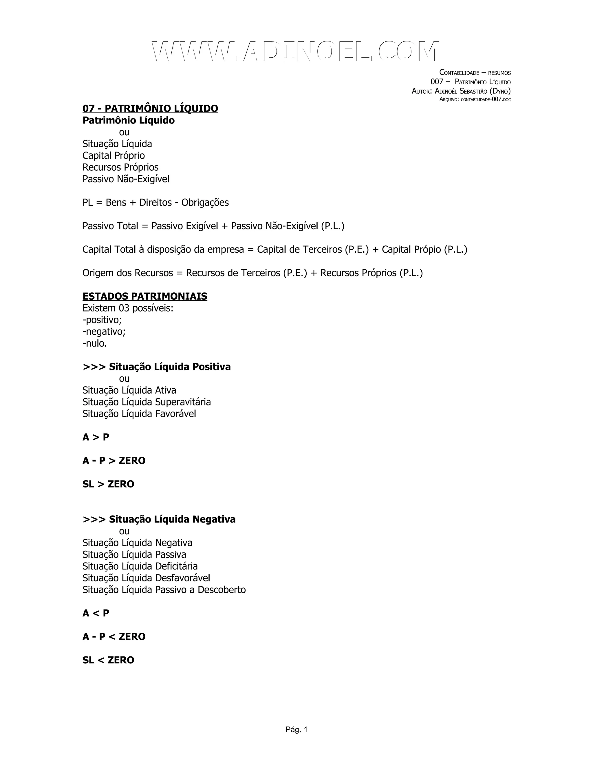 O documento discute o conceito de patrimônio líquido em contabilidade, definindo-o como a diferença entre os bens e direitos de uma empresa e suas obrigações. Explica que o patrimônio líquido pode ser positivo, negativo ou nulo dependendo se os ativos superam, são inferiores ou iguais ao passivo. Também lista os componentes do patrimônio líquido de acordo com a lei contábil brasileira.