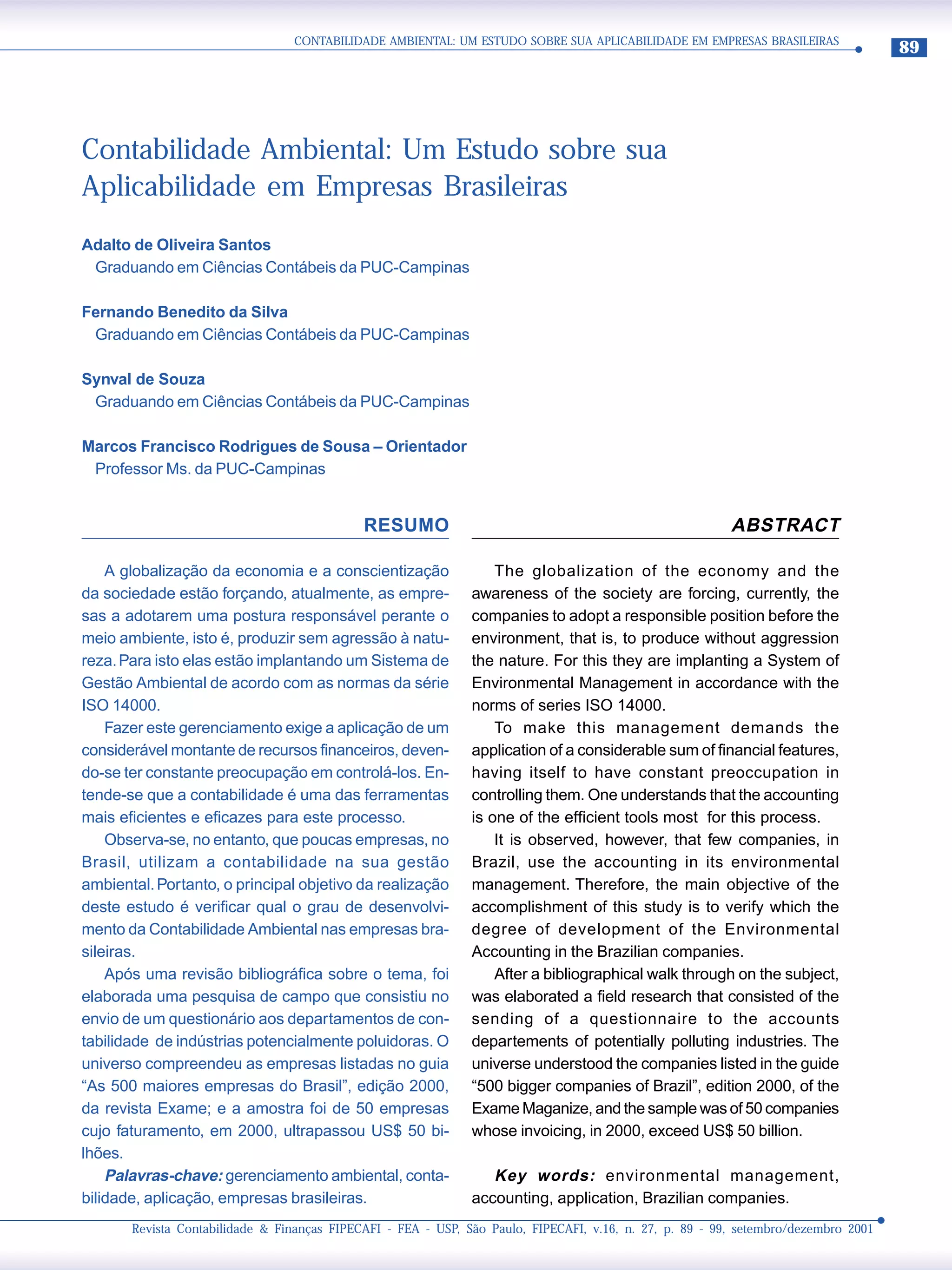 Este documento discute a aplicabilidade da contabilidade ambiental em empresas brasileiras. Ele apresenta conceitos básicos de contabilidade ambiental e realiza uma pesquisa com 50 grandes empresas brasileiras para avaliar o nível de desenvolvimento da contabilidade ambiental nestas organizações. Os resultados sugerem que poucas empresas no Brasil utilizam a contabilidade para gerenciamento ambiental, apesar de sua potencial para auxiliar nesse processo.