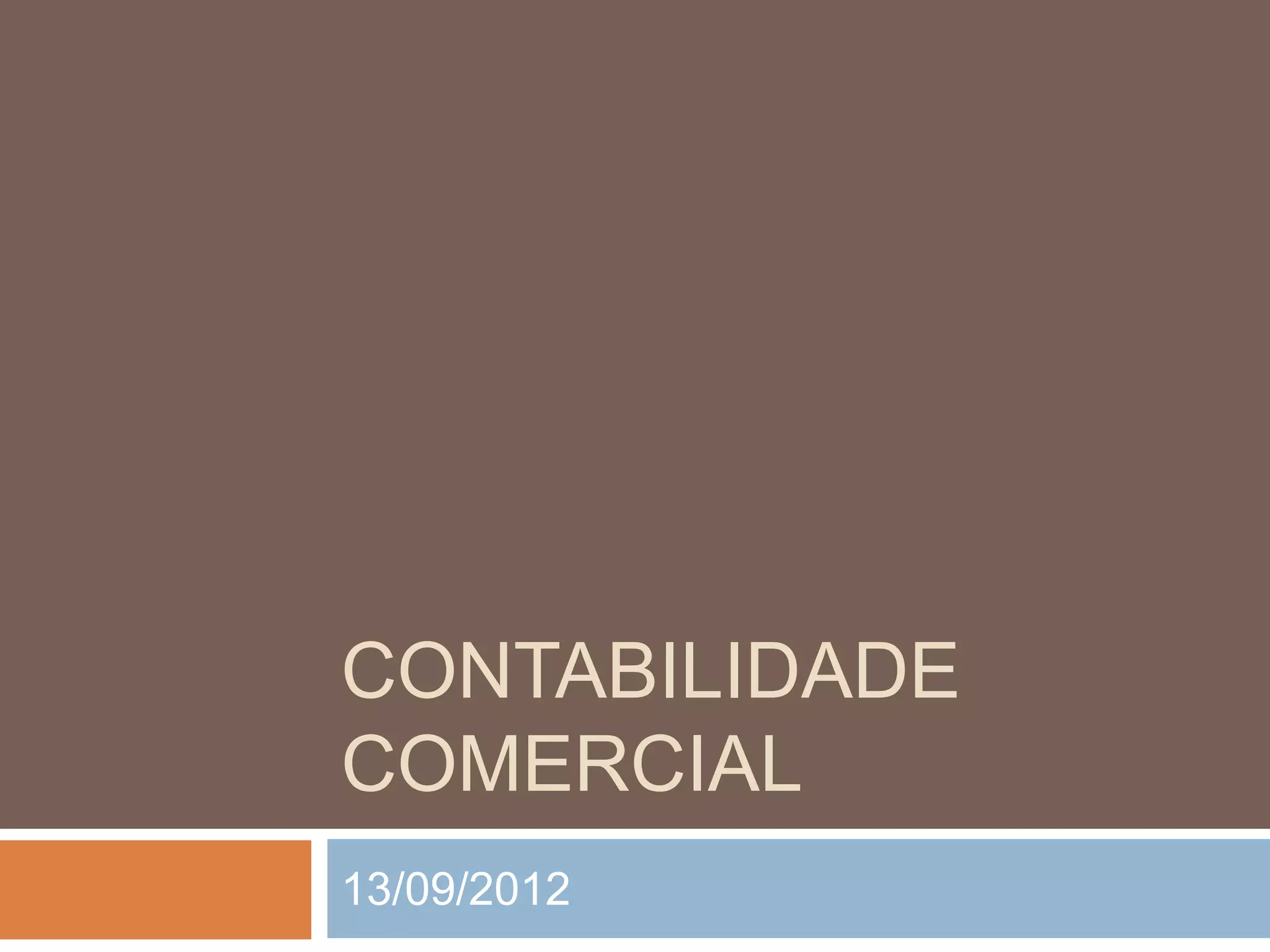 O documento discute conceitos fundamentais de contabilidade comercial, incluindo ganhos, perdas, receitas, despesas, investimentos, custos, desembolsos, tipos de sociedades, impostos sobre vendas e operações com mercadorias.