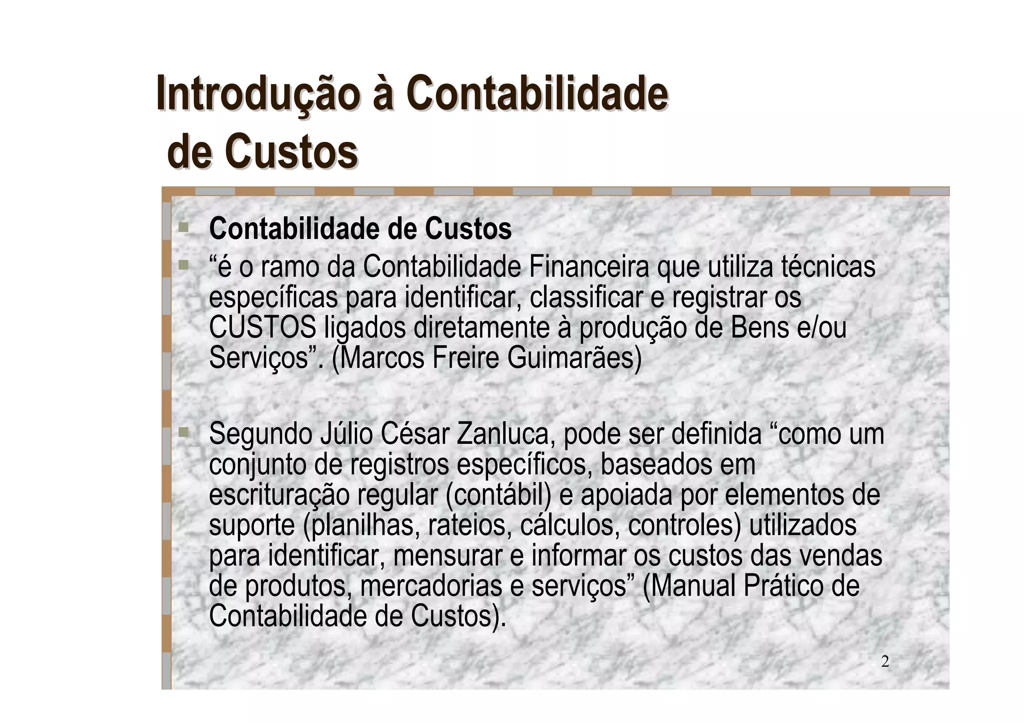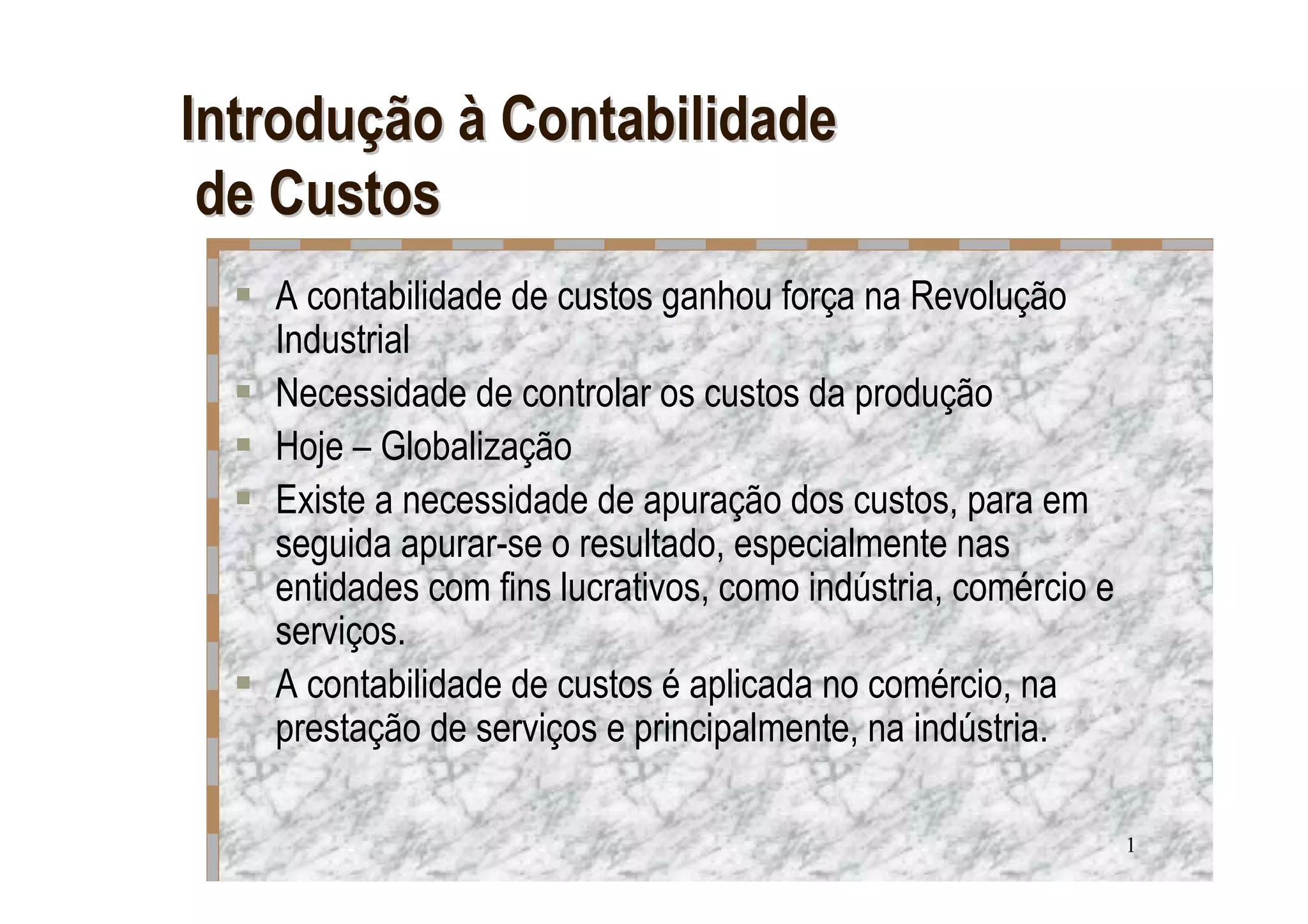 O documento discute a contabilidade de custos, que surgiu para controlar os custos da produção durante a Revolução Industrial e ainda é importante hoje para apurar custos e resultados. A contabilidade de custos identifica, classifica e registra custos ligados à produção e fornece informações para tomada de decisões gerenciais.