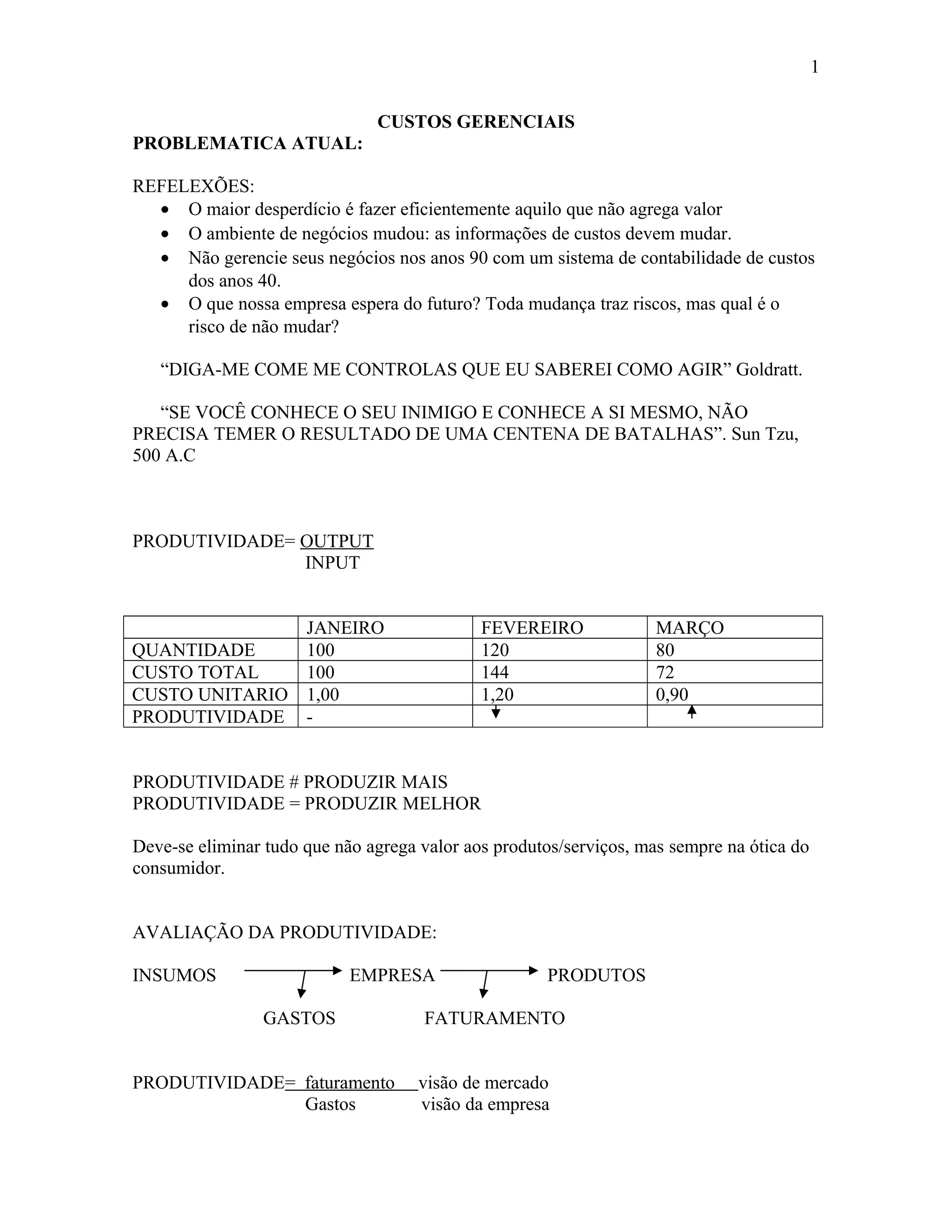 O documento discute a importância de se atualizar os sistemas de custos das empresas para acompanhar as mudanças no ambiente de negócios. Apresenta exemplos mostrando como métodos de custeio desatualizados podem levar a conclusões equivocadas sobre a produtividade e lucratividade. Defende que é necessário eliminar desperdícios e adotar uma visão de valor agregado para melhor gerenciar os custos.