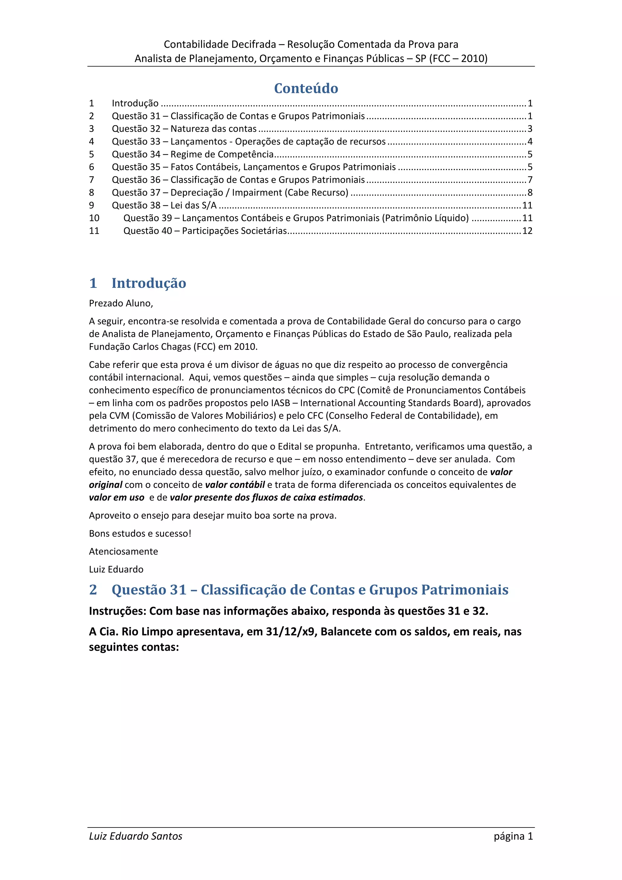 O documento apresenta a resolução comentada de uma prova de contabilidade para o cargo de Analista de Planejamento, Orçamento e Finanças Públicas do Estado de São Paulo aplicada pela FCC em 2010. O texto discute as questões da prova, explicando os conceitos envolvidos e apontando a alternativa correta para cada uma. Há também um comentário sobre uma questão que merece recurso por confundir conceitos contábeis.