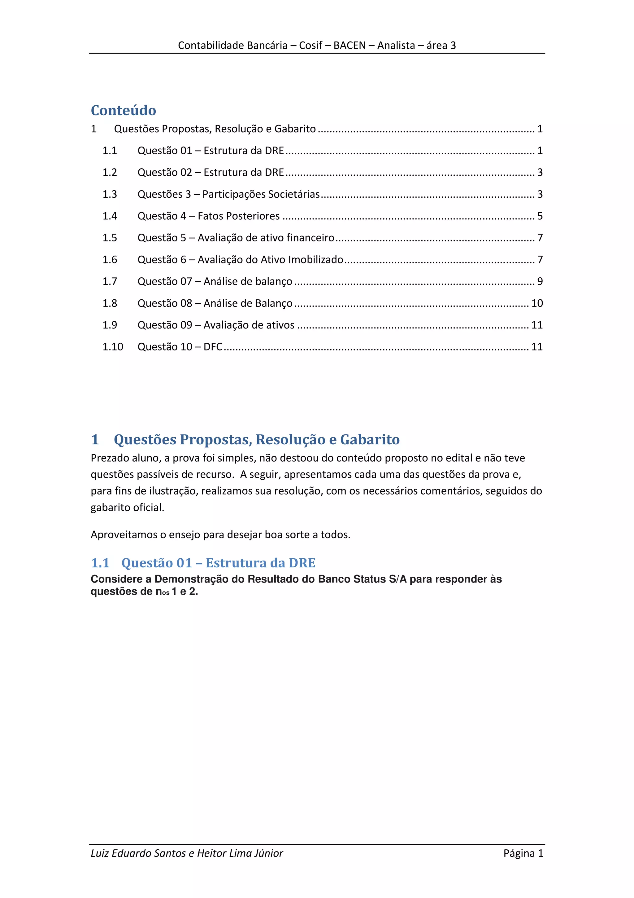 Este documento apresenta 10 questões de prova sobre contabilidade bancária, com suas respectivas resoluções e gabaritos. As questões abordam tópicos como estrutura da demonstração do resultado, participações societárias, fatos posteriores e análise de balanços.