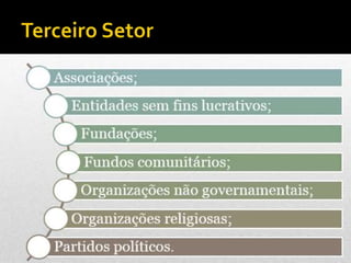 1) As entidades do 3o setor tem como objetivo realizar atividades beneficentes, filantrópicas e sociais. Seu crescimento tem sido causado pelo aumento das necessidades socioeconômicas e da participação voluntária da sociedade.