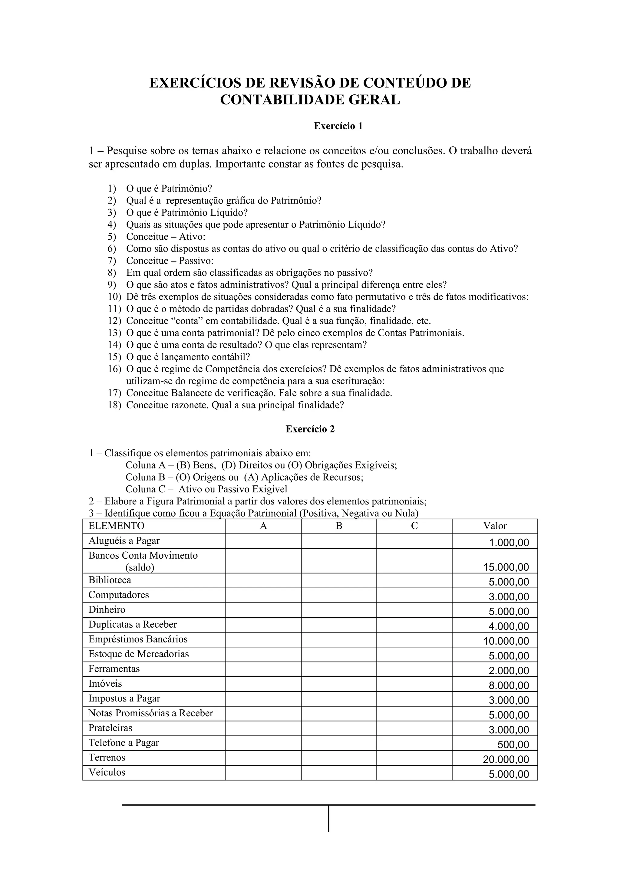 O documento contém 4 exercícios sobre contabilidade geral com questões sobre conceitos como patrimônio, ativo, passivo e lançamentos contábeis. Os exercícios pedem para identificar e classificar elementos patrimoniais, calcular patrimônio líquido e resultado líquido a partir de saldos de contas, e determinar valores de ativo, passivo e patrimônio a partir de balanços patrimoniais.