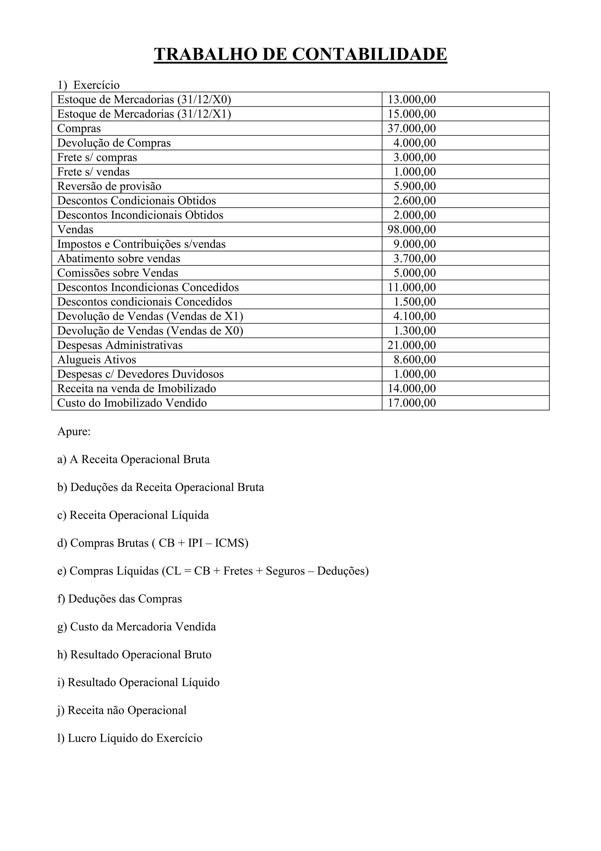 O documento apresenta as contas de uma empresa de prestação de serviços de assistência técnica. Ele lista os saldos das contas no balancete de verificação em 30/11/X1 e as operações realizadas em dezembro, incluindo pagamentos, recebimentos, compras, aumento de capital e despesas.