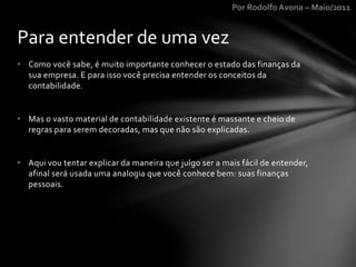 O documento explica os principais relatórios financeiros de uma empresa: (1) Balanço Patrimonial, que mostra a origem e destino dos recursos financeiros em um momento; (2) Demonstrativo de Resultado (DRE), que mostra o desempenho financeiro em um período; e (3) Fluxo de Caixa, que apresenta as mudanças no caixa da empresa. Exemplos pessoais são usados para ilustrar cada relatório de forma simples. O documento conclui que esses três relatórios são complementares e necessários para ter uma visão