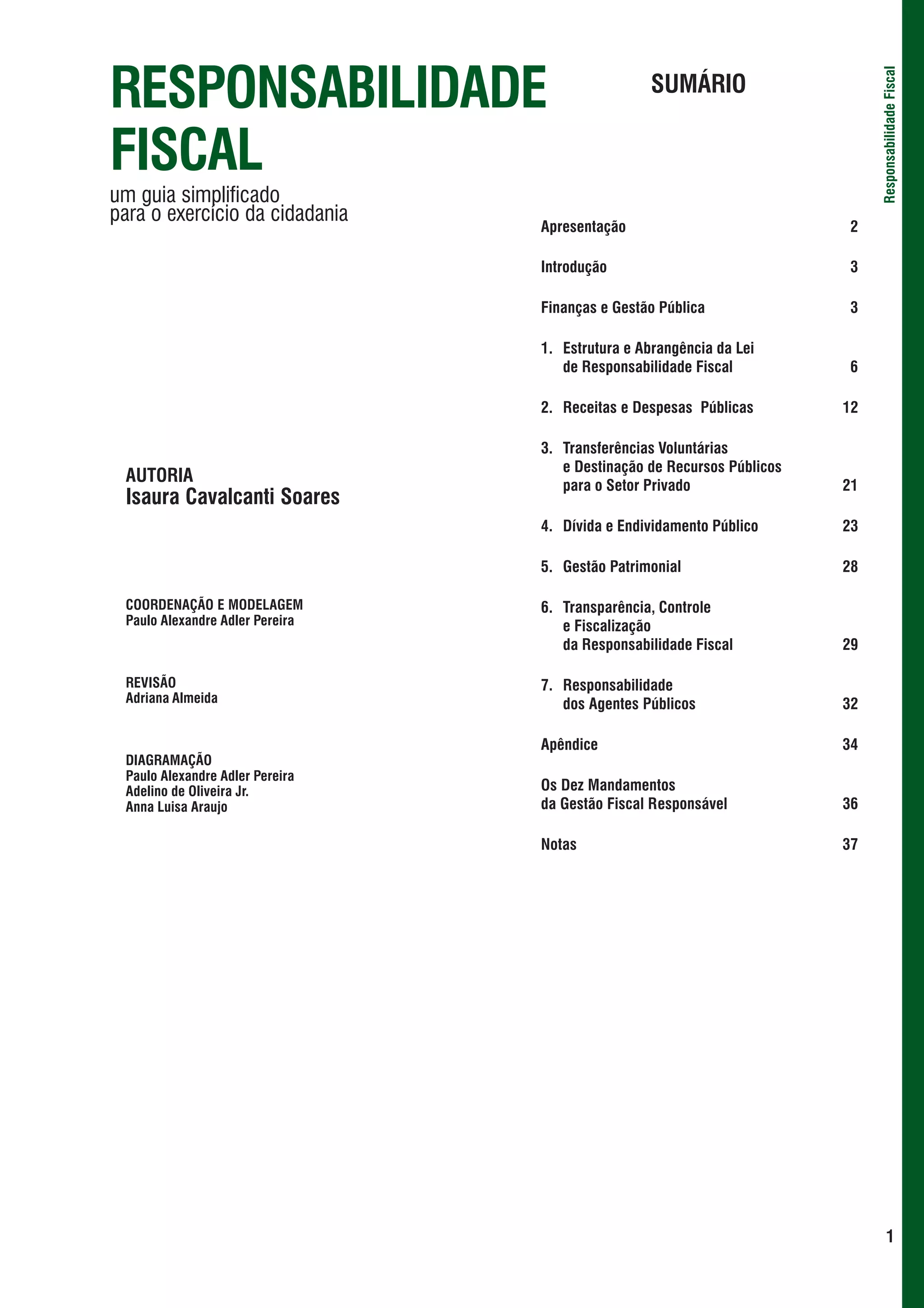 Este documento fornece um guia simplificado sobre a Lei de Responsabilidade Fiscal, abordando conceitos como planejamento governamental, receitas e despesas públicas, dívida pública e gestão fiscal transparente. O objetivo é auxiliar cidadãos a entenderem a lei e exercerem seu papel de fiscalização.
