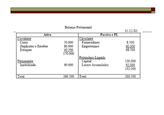 O documento discute fundamentos da contabilidade, incluindo sua definição, objetivos, processos, princípios e usuários. Aborda também conceitos como ativo, passivo, patrimônio líquido, receita e despesa. Fornece exemplos práticos sobre registro contábil e depreciação.