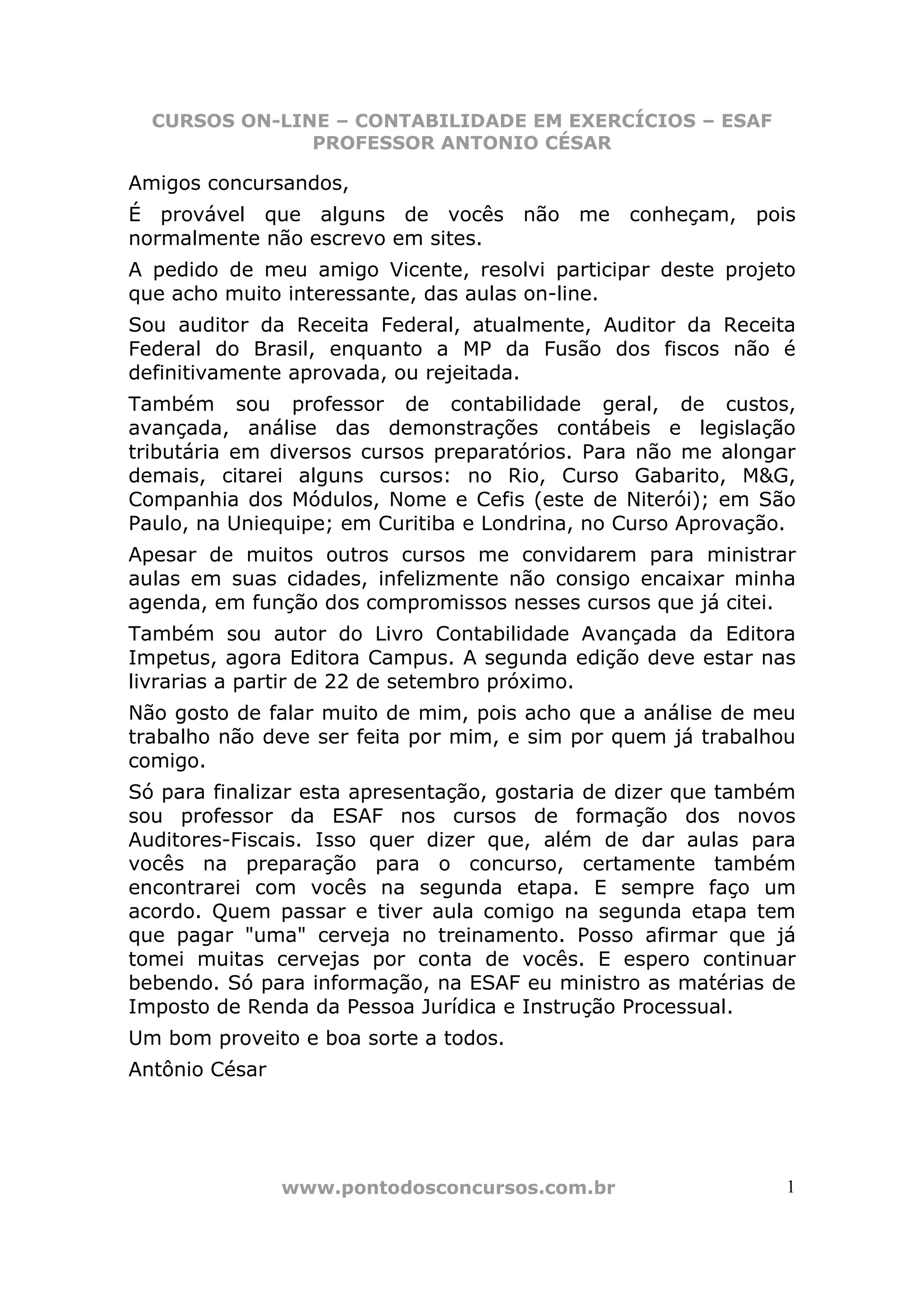 Este documento apresenta um resumo de um curso online sobre operações com mercadorias para concursos da área fiscal. O professor Antonio César define mercadorias e explica a contabilização das compras de mercadorias com incidência de ICMS, PIS e COFINS pelo regime da não-cumulatividade, reconhecendo valores em contas como "ICMS a Recuperar".