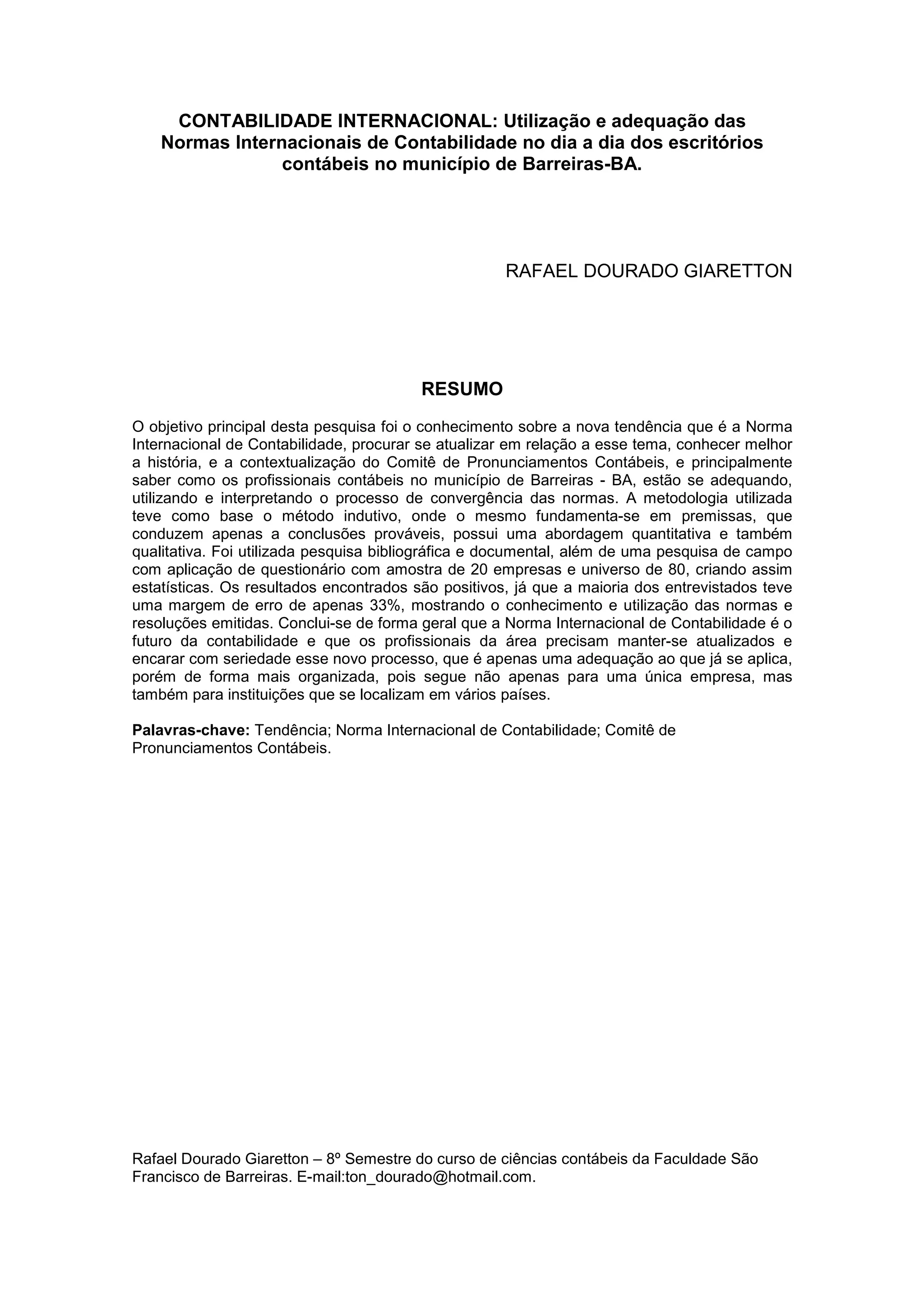 O documento discute a utilização e adequação das Normas Internacionais de Contabilidade (NIC) nos escritórios contábeis de Barreiras-BA. A pesquisa mostrou que a maioria dos entrevistados demonstrou bom conhecimento e utilização das normas, apesar de alguns desafios de implementação. Conclui-se que as NIC são o futuro da contabilidade e os profissionais precisam se manter atualizados.