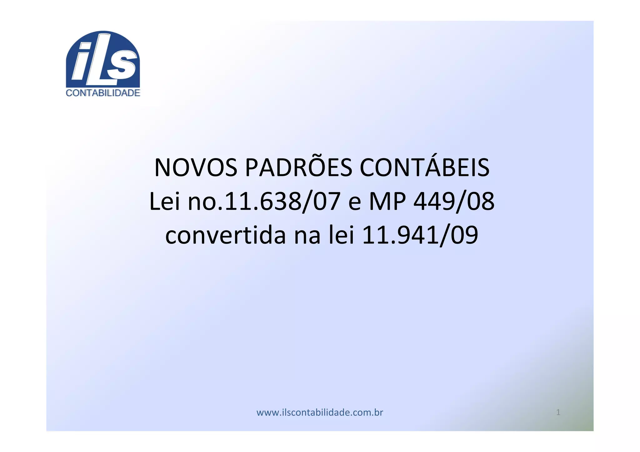 O documento discute a Lei 11.638/07 que introduziu mudanças importantes na Lei das Sociedades Anônimas visando a convergência da contabilidade brasileira aos princípios contábeis internacionais. As principais alterações incluem a adoção do modelo de avaliação a valor justo, regras para o reconhecimento de ativos e passivos, e a criação do Regime Tributário de Transição para garantir a neutralidade fiscal durante o processo de convergência.