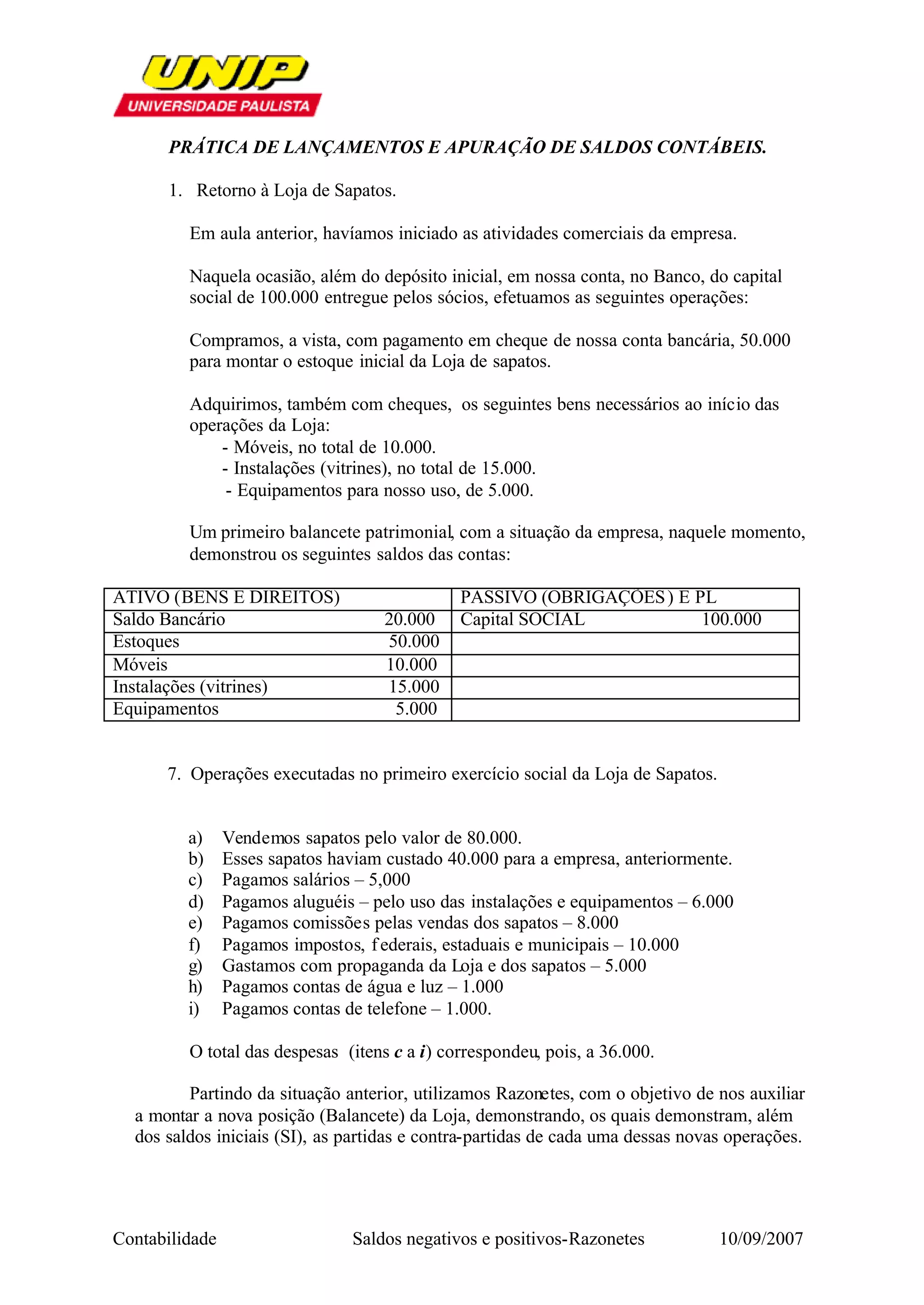 O documento descreve as operações realizadas no primeiro exercício social de uma loja de sapatos, incluindo a compra inicial de estoque e equipamentos, vendas, despesas e apuração dos saldos contábeis. Ele explica como os razonetes foram usados para registrar as transações e calcular os novos saldos das contas, resultando em um lucro de R$4.000.