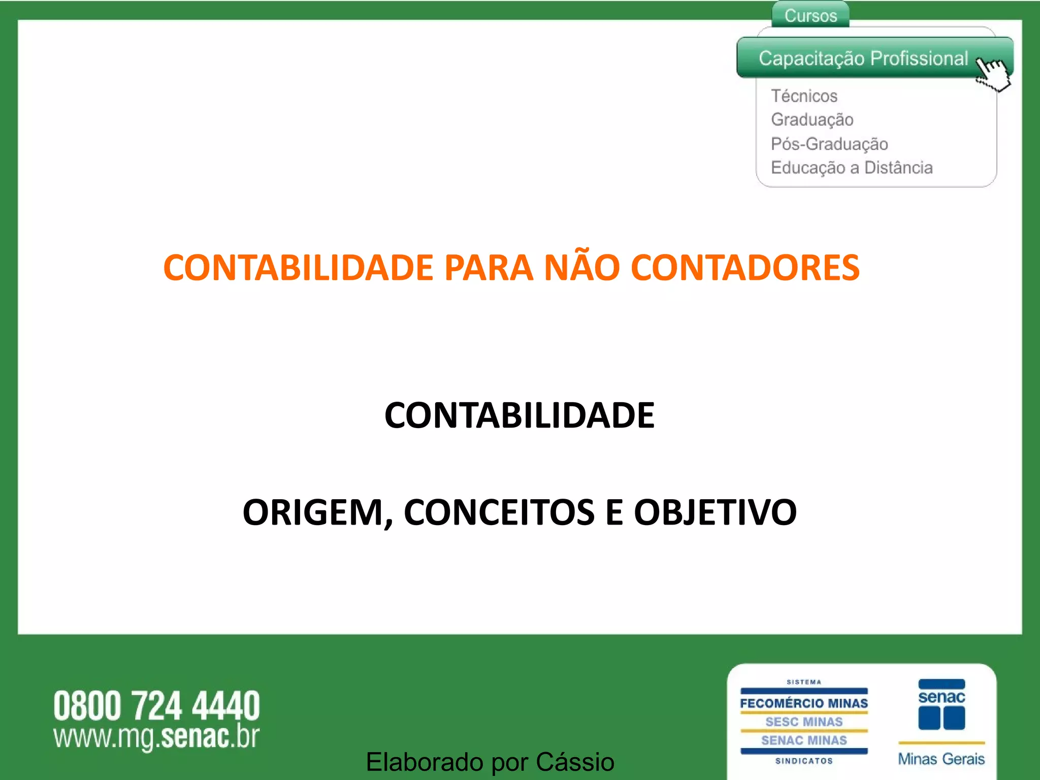 CONTABILIDADE PARA NÃOCONTADORES CONTABILIDADE ORIGEM, CONCEITOS E OBJETIVO Elaborado por Cássio