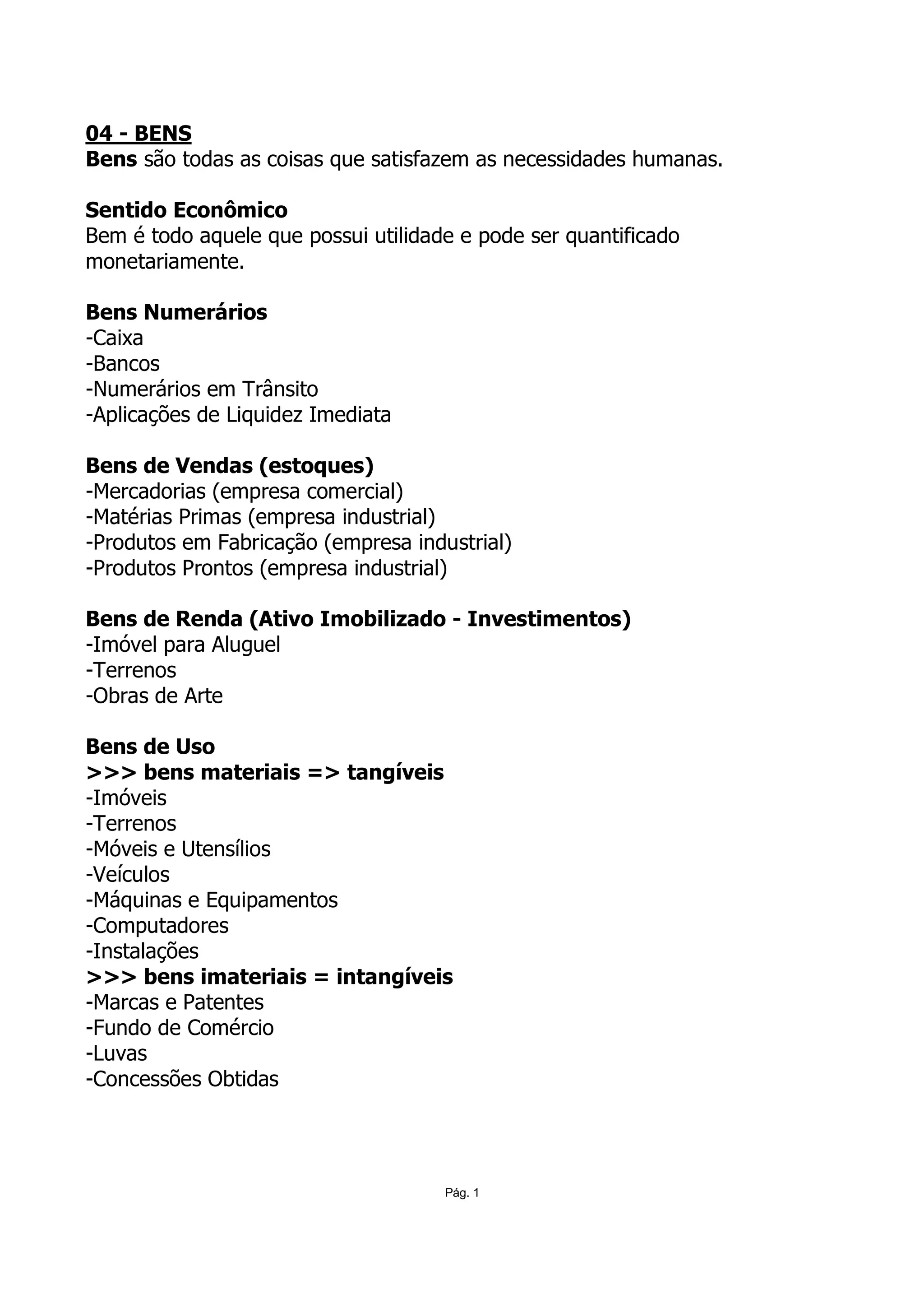 O documento classifica os diferentes tipos de bens em Bens Numerários, Bens de Vendas, Bens de Renda e Bens de Uso, distinguindo entre bens materiais tangíveis como imóveis, terrenos e máquinas, e bens imateriais intangíveis como marcas e patentes.