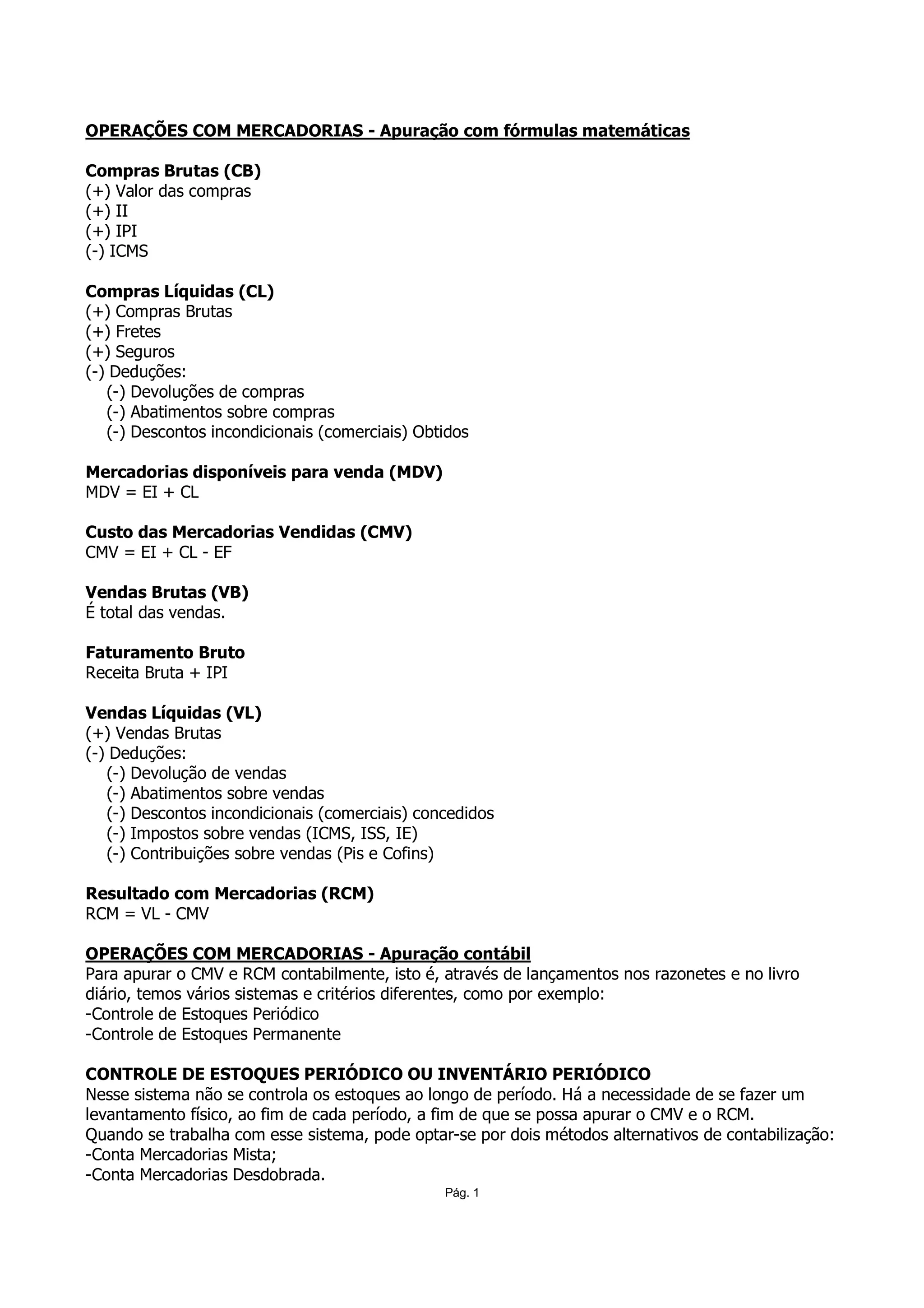 O documento descreve métodos para calcular operações com mercadorias usando fórmulas matemáticas e contabilidade, incluindo: (1) compras brutas, compras líquidas, mercadorias disponíveis e custo das mercadorias vendidas; (2) controle de estoques periódico e permanente; e (3) métodos como conta única e desdobrada.