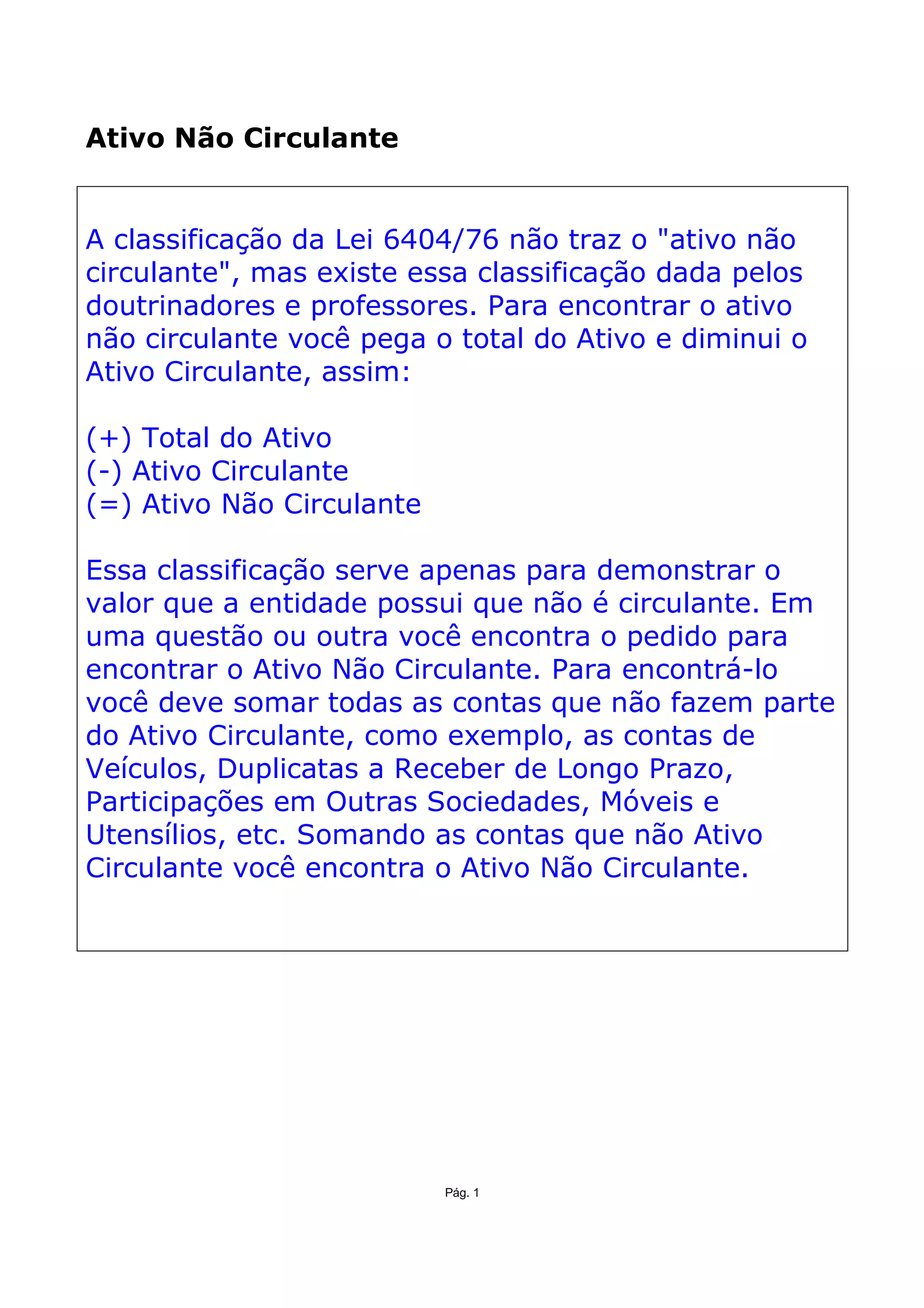 O documento explica que a Lei 6404/76 não menciona o termo "ativo não circulante", mas é usado por acadêmicos para descrever o total do ativo menos o ativo circulante. Ele também detalha que o ativo não circulante é calculado somando contas como veículos, duplicatas de longo prazo, participações em outras empresas, móveis e utensílios que não fazem parte do ativo circulante.