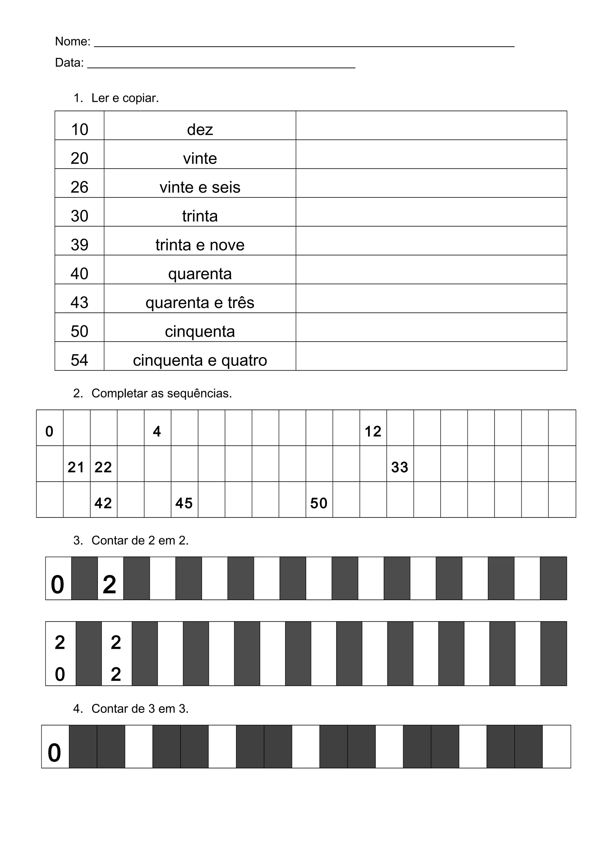 O documento apresenta uma lista de números de 1 a 50 escritos por extenso para copiar, seguido de exercícios de contagem sequencial de 2 em 2, de 3 em 3 e de 5 em 5 e 10 em 10 para completar.