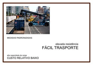 Container possui medidas padronizadas, alta resistência e capacidade de carga, permitindo fácil transporte e custo relativo baixo. Sua modularidade e capacidade de empilhamento proporcionam funcionalidade, espaço e ambientes para inovação com identidade e solidez.