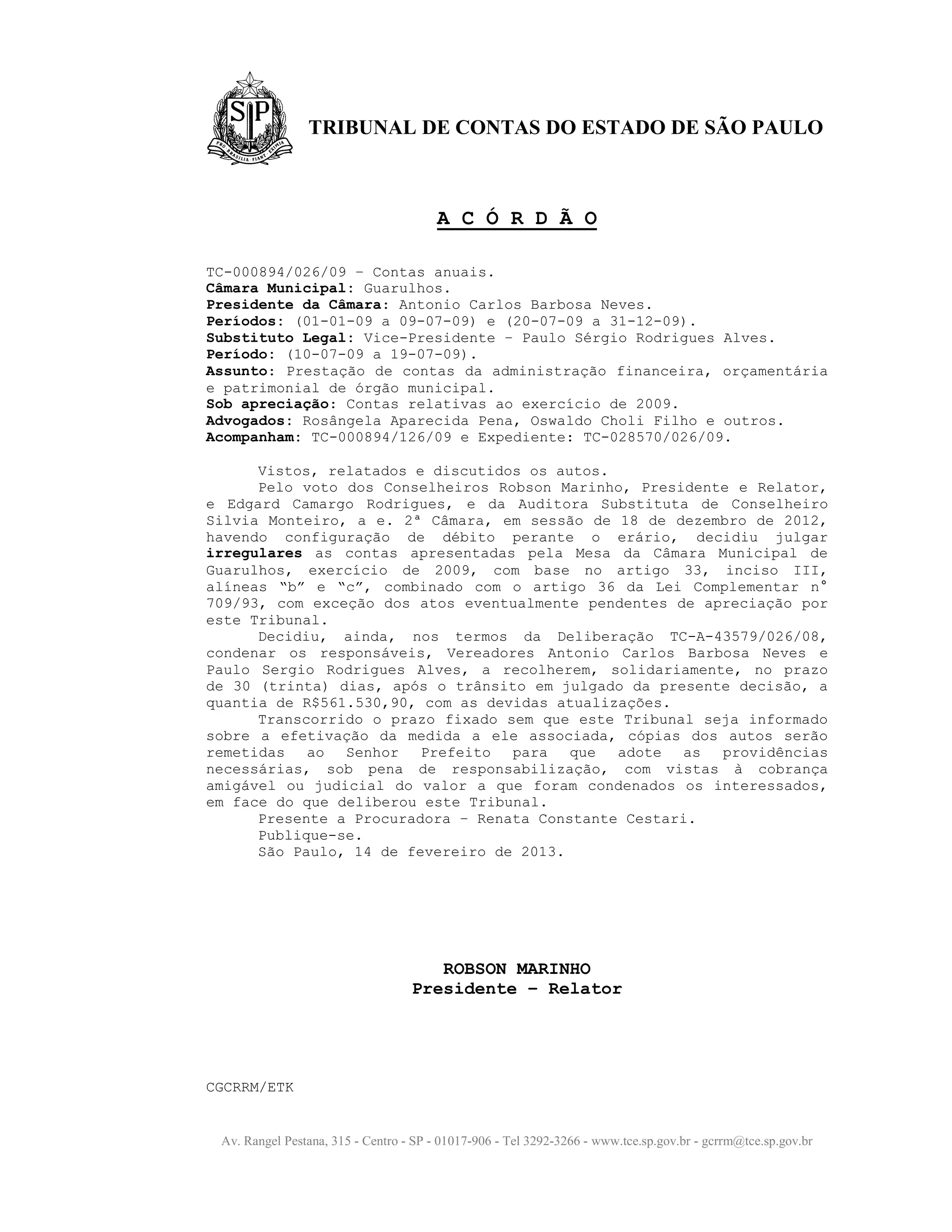 O Tribunal de Contas do Estado de São Paulo julgou irregulares as contas da Câmara Municipal de Guarulhos referentes ao exercício de 2009. Os vereadores Antonio Carlos Barbosa Neves e Paulo Sérgio Rodrigues Alves foram condenados a recolher solidariamente R$561.530,90 em 30 dias. Se o valor não for pago, cópias serão enviadas ao prefeito para cobrança amigável ou judicial.