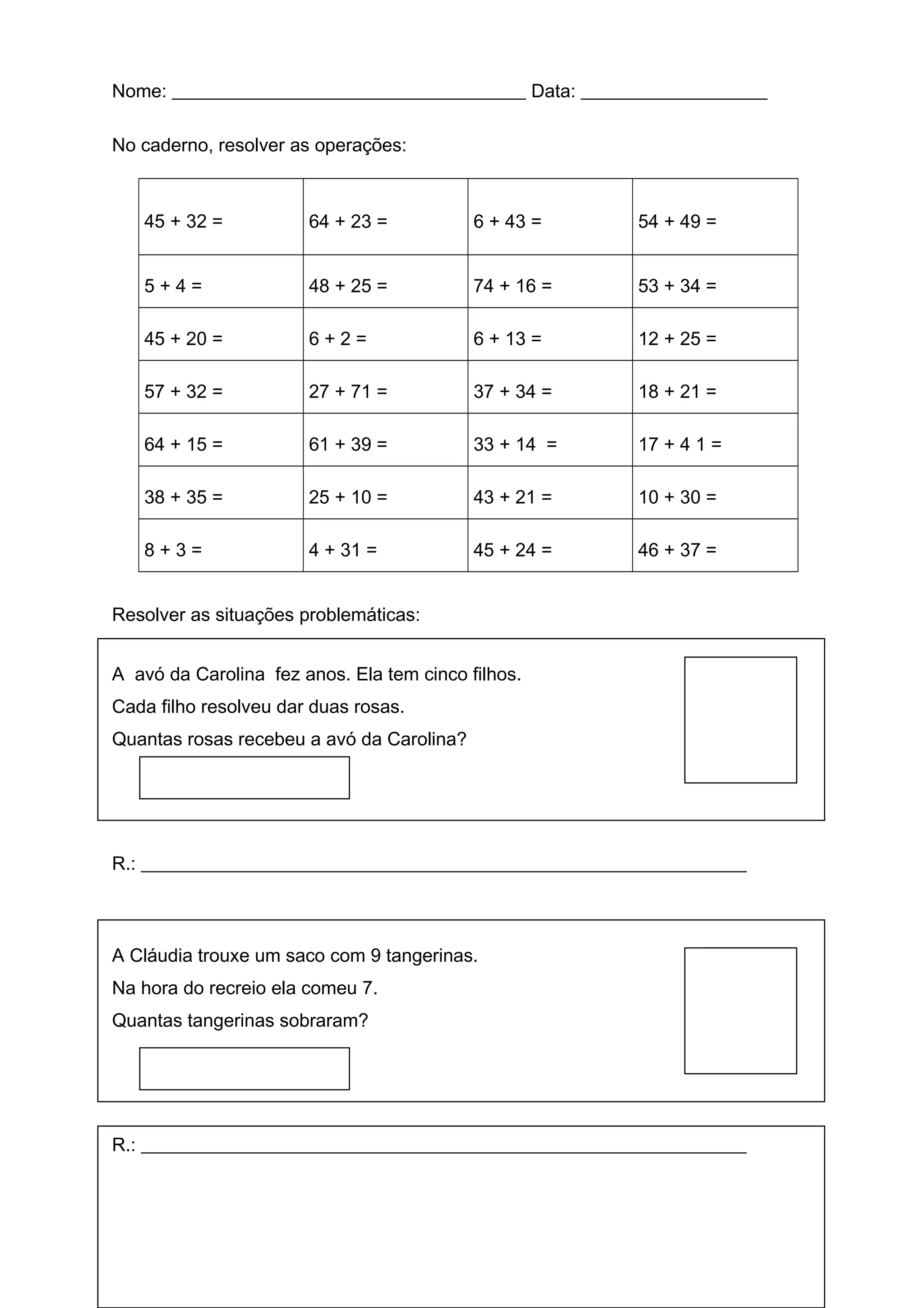O documento pede para resolver operações aritméticas simples e problemas matemáticos envolvendo adição, subtração e multiplicação. As questões incluem o número de rosas recebidas por uma avó com cinco filhos que deram duas rosas cada um e a quantidade de tangerinas sobrando após uma criança comer 7 de um saco inicial de 9 frutas.