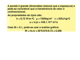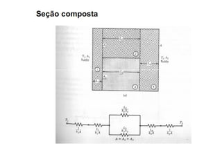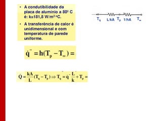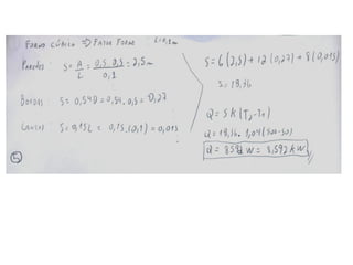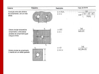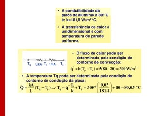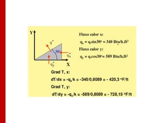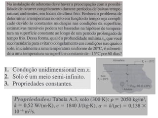 O documento aborda a transferência de calor por condução, discutindo fundamentais como a lei de Fourier e a condutibilidade térmica dos materiais. São explorados diferentes aspectos da condução unidimensional e bidimensional, incluindo condições de contorno e a aplicação de aletas para aumentar a transferência de calor. Além disso, exemplifica a análise de sistemas térmicos e suas equações, com foco na eficiência e no balanceamento energético.