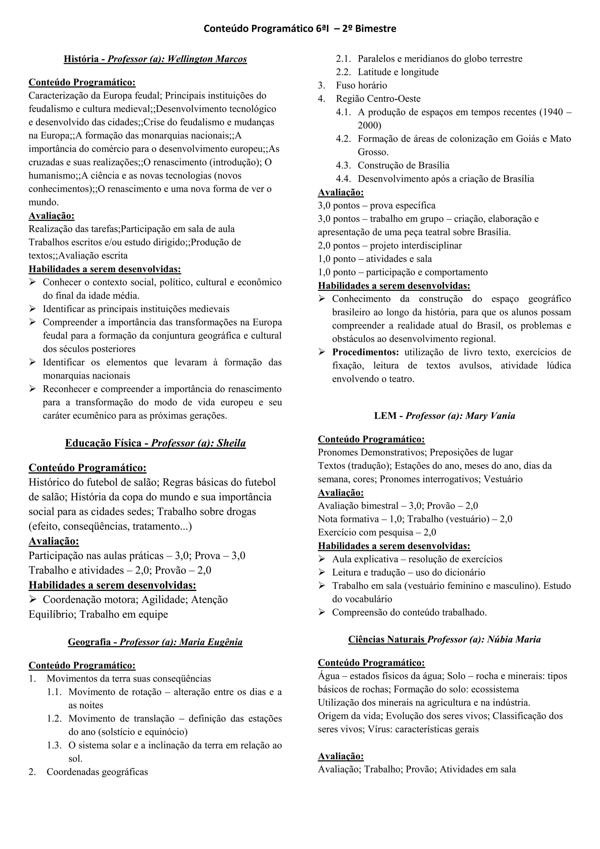 Este documento fornece os conteúdos programáticos e formas de avaliação para as disciplinas de História, Educação Física, Geografia, Ciências Naturais, Matemática e Português no 2o bimestre. Os conteúdos incluem tópicos como a Europa feudal, futebol de salão, coordenadas geográficas, água e solo, números decimais e porcentagens, e classes gramaticais. As avaliações consistirão em provas, trabalhos, projetos e participação.