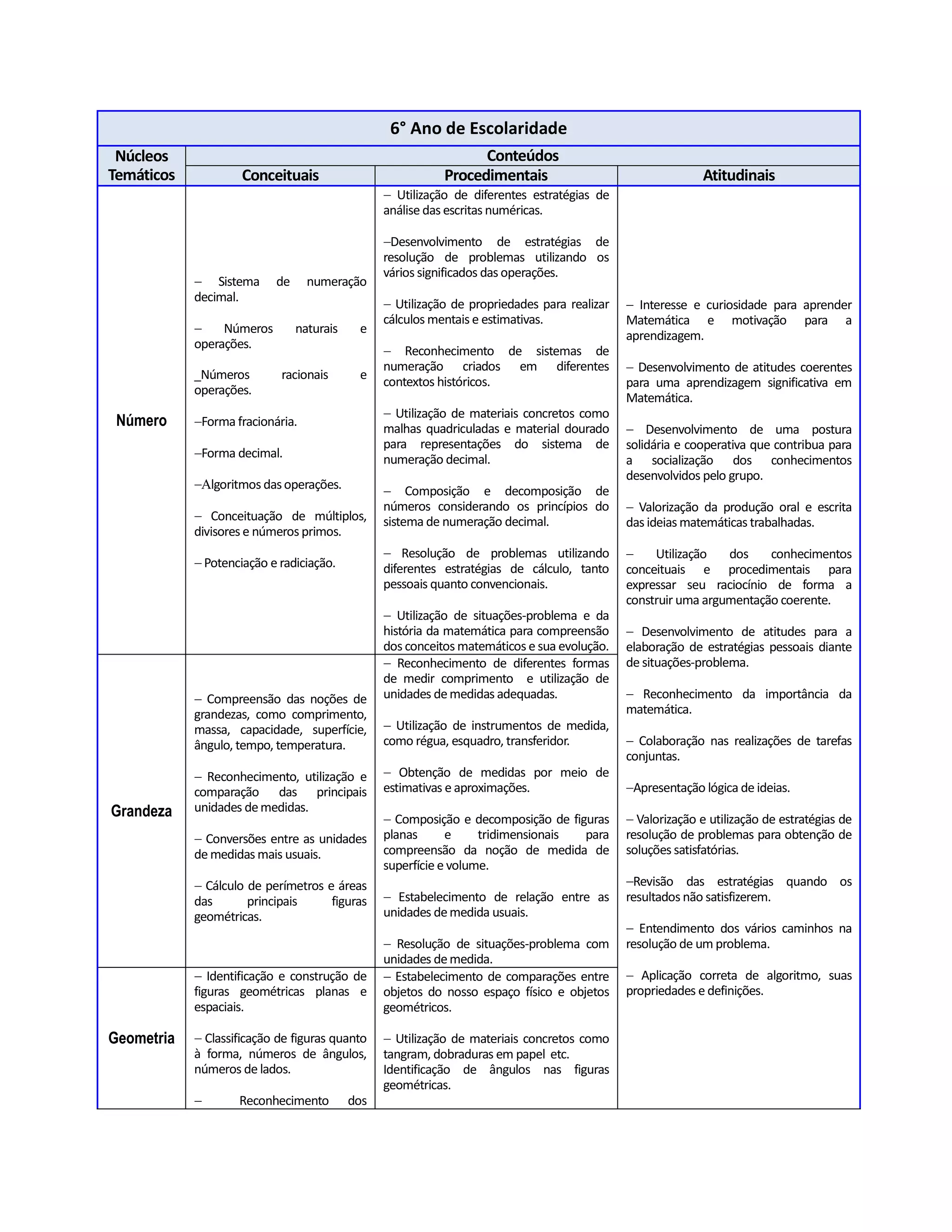 Este documento apresenta os conteúdos, conceitos, procedimentos e atitudes a serem desenvolvidos nos 6°, 7° e 8° anos do ensino fundamental nos temas de Números, Grandezas, Geometria, Álgebra e Tratamento da Informação. Para cada ano são listados os principais tópicos a serem abordados em cada tema, assim como as habilidades correspondentes.