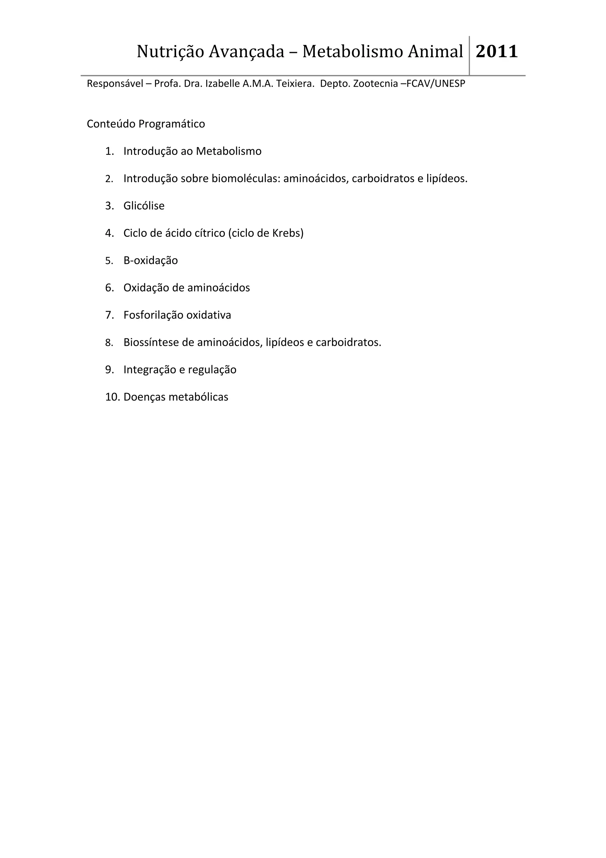 O documento apresenta o conteúdo programático de uma disciplina de Nutrição Avançada - Metabolismo Animal ministrada pela Profa. Dra. Izabelle A.M.A. Teixiera. O programa inclui tópicos sobre introdução ao metabolismo, biomoléculas, processos metabólicos como glicólise e ciclo de Krebs, biossíntese e regulação metabólica. A primeira aula é de boas-vindas e apresenta os objetivos de ensino e aprendizagem baseados em mapas mentais.