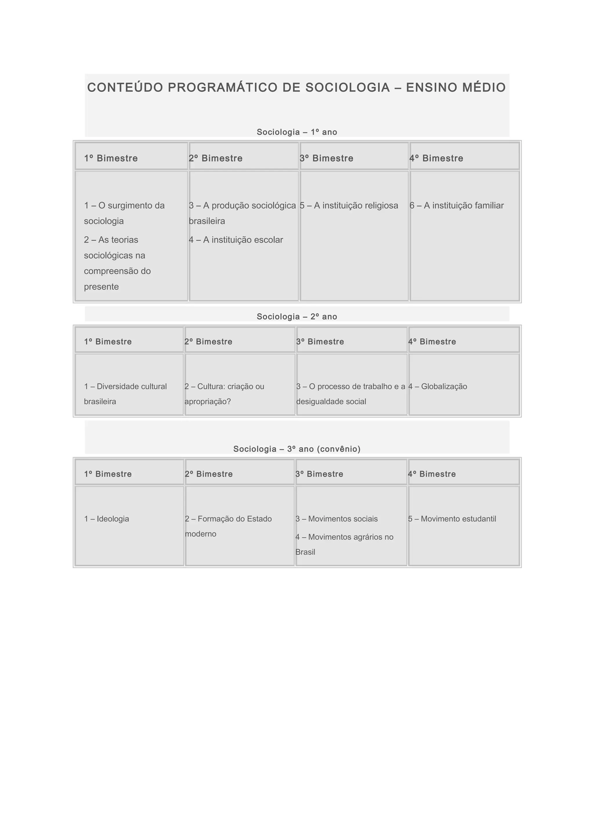O documento apresenta o conteúdo programático de Sociologia para o Ensino Médio, dividido em três anos. No 1o ano, aborda o surgimento da sociologia, teorias sociológicas e as instituições religiosa e escolar. No 2o ano, trata da diversidade cultural brasileira, cultura e desigualdade social e globalização. No 3o ano, discute ideologia, Estado moderno e movimentos sociais e agrários.