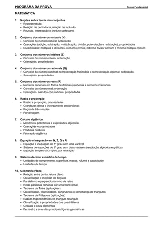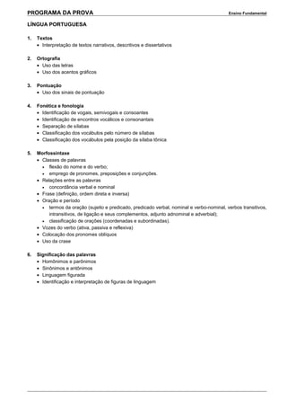 O documento apresenta os conteúdos programáticos para a prova do Ensino Fundamental em Língua Portuguesa, Matemática e Ciências, abrangendo tópicos como interpretação e análise de textos, ortografia, gramática, números, operações matemáticas, geometria, propriedades da matéria, energia, mecânica, eletricidade, luz, som, seres vivos e o corpo humano.